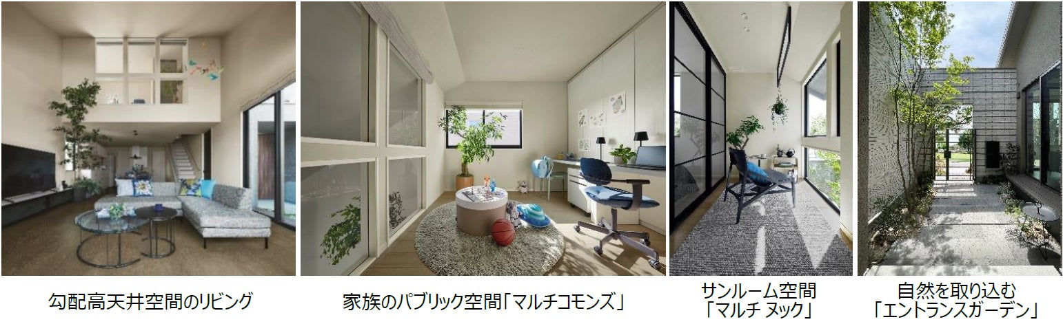 特徴的な大屋根形態の「ミニマルECOフォルム」は、大容量の太陽光パネルを搭載し、コンパクトな床面積でもLCCM住宅を実現。高天井による豊かな居住空間を実現し、いつも(日常)の暮らしと、もしも(災害時)の生活を支えるレジリエンス性能に優れた住まいです。心地よい空間を構成する勾配高天井空間が上下階をつなぎ、家族を見守りつつも互いに気配を感じる安心感をもたらすとともにタテへの拡がりが実面積よりも広びろと感じられ、一人ひとりが自由に活動できるパブリック空間「マルチコモンズ」や、屋外の自然を身近に感じられるサンルーム空間「マルチ ヌック」によって、家族の多様なニーズを叶えます。