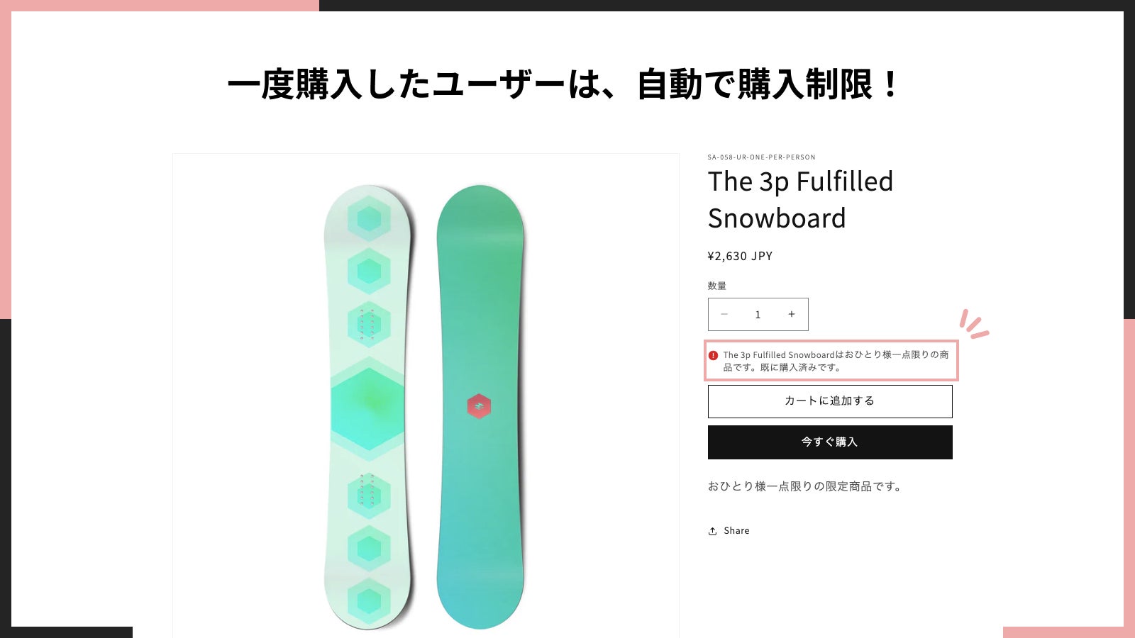 「シンプルおひとり様一点限りの購入制限設定」では、購入制限設定された商品を一度購入したユーザーに対して、その商品の購入を自動で制限します。