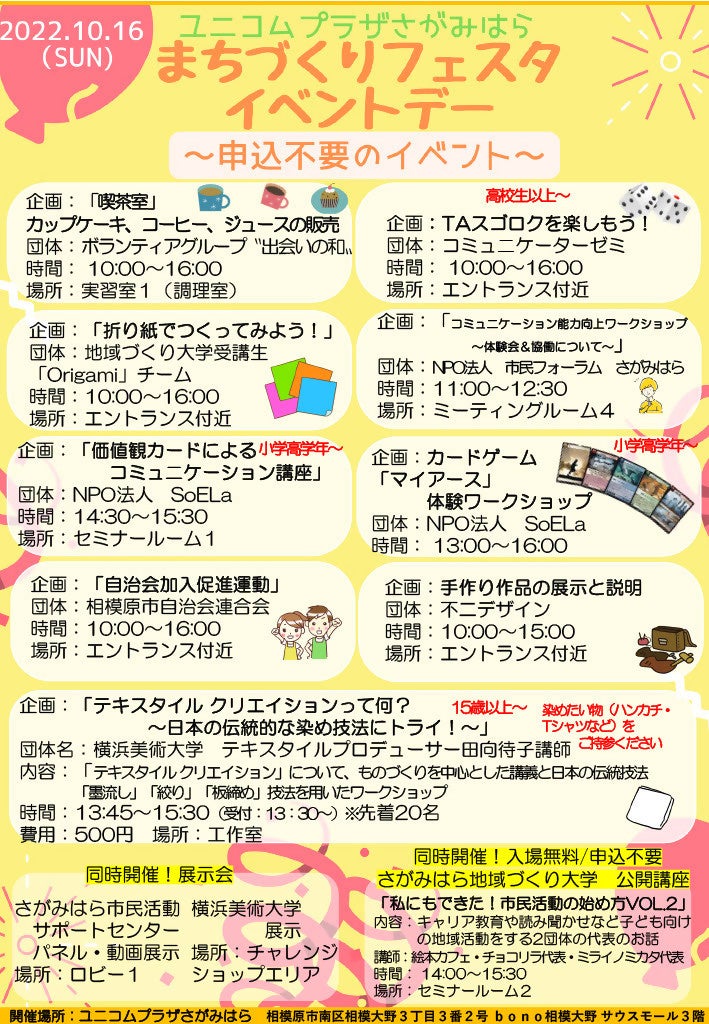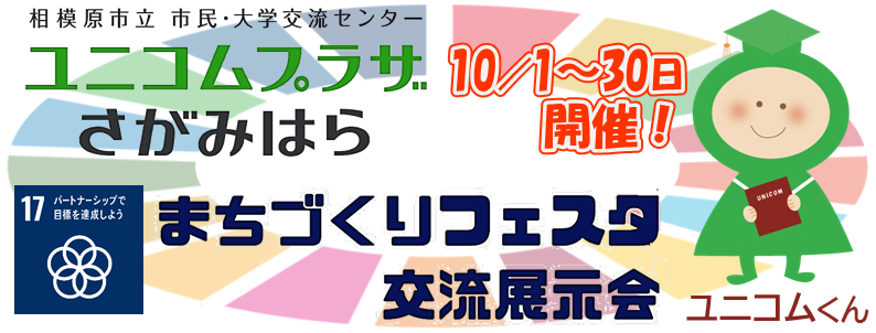 相模原市立市民・大学交流センター(愛称:ユニコムプラザさがみはら)では、地域活動団体や学生などによる地域貢献活動や研究成果などを発表し、相互に学ぶ機会として「まちづくりフェスタ」を開催します。