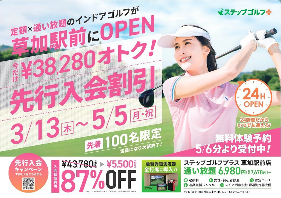 全国に129店舗、670打席のインドアゴルフスクールを運営するステップゴルフ株式会社(本社:東京都渋谷区、代表取締役:榎本考修 以下、ステップゴルフ)は、2025年5月8日(木)より、東武伊勢崎線・東武スカイツリーラインの草加駅徒歩1分のケイユービル6Fに『ステップゴルフプラス草加駅前店』をグランドオープン予定※です。また、現在は先行入会を店頭にて受付中です。