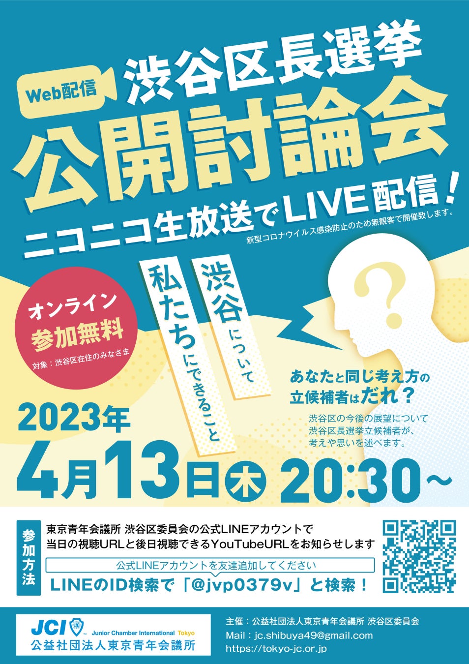 公益社団法人東京青年会議所(所在地:東京都千代田区平河町、理事長:下山田 敬介)は、渋谷区長選挙の公開討論会を4月13日(木)20:30よりニコニコ生放送で配信します。