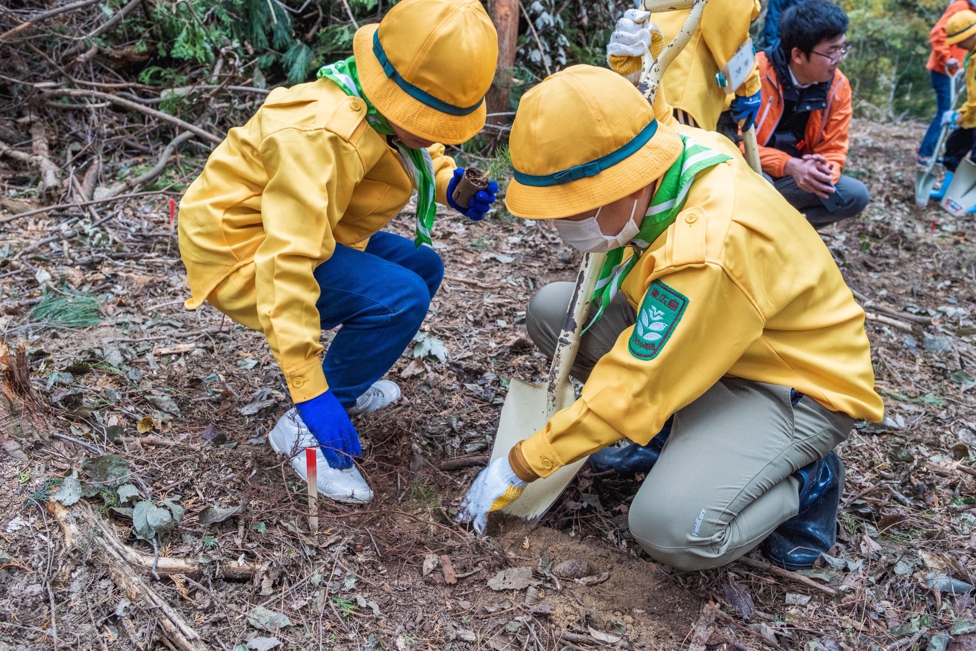 植樹活動では、賀茂地方森林組合のサポートのもと、約600本の苗木を植樹し、活動に参加した子どもたちに植樹や自然をより身近に感じてもらうことができました。また、参加者には、協賛企業であるカルビー株式会社から記念品としてお菓子がプレゼントされたほか、ナッジ株式会社から参加記念のNFTを配しました。