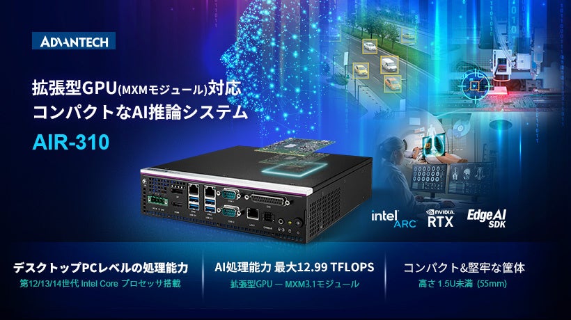アドバンテック株式会社(TWSE:2395 東京都台東区、以下、アドバンテック)は、MXMモジュールタイプの GPUカードに対応したコンパクトなエッジAI推論システム「AIR-310」の発売を開始いたします。第12/13/14世代 インテルCoreデスクトップ プロセッサに対応した本製品は、高さ1.5U(サイズ:215 x 225 x 55 mm)の筐体に、MXM3.1 Type Aに準拠したMXM GPUカードが搭載可能なコンパクトサイズのエッジAI推論システムです。