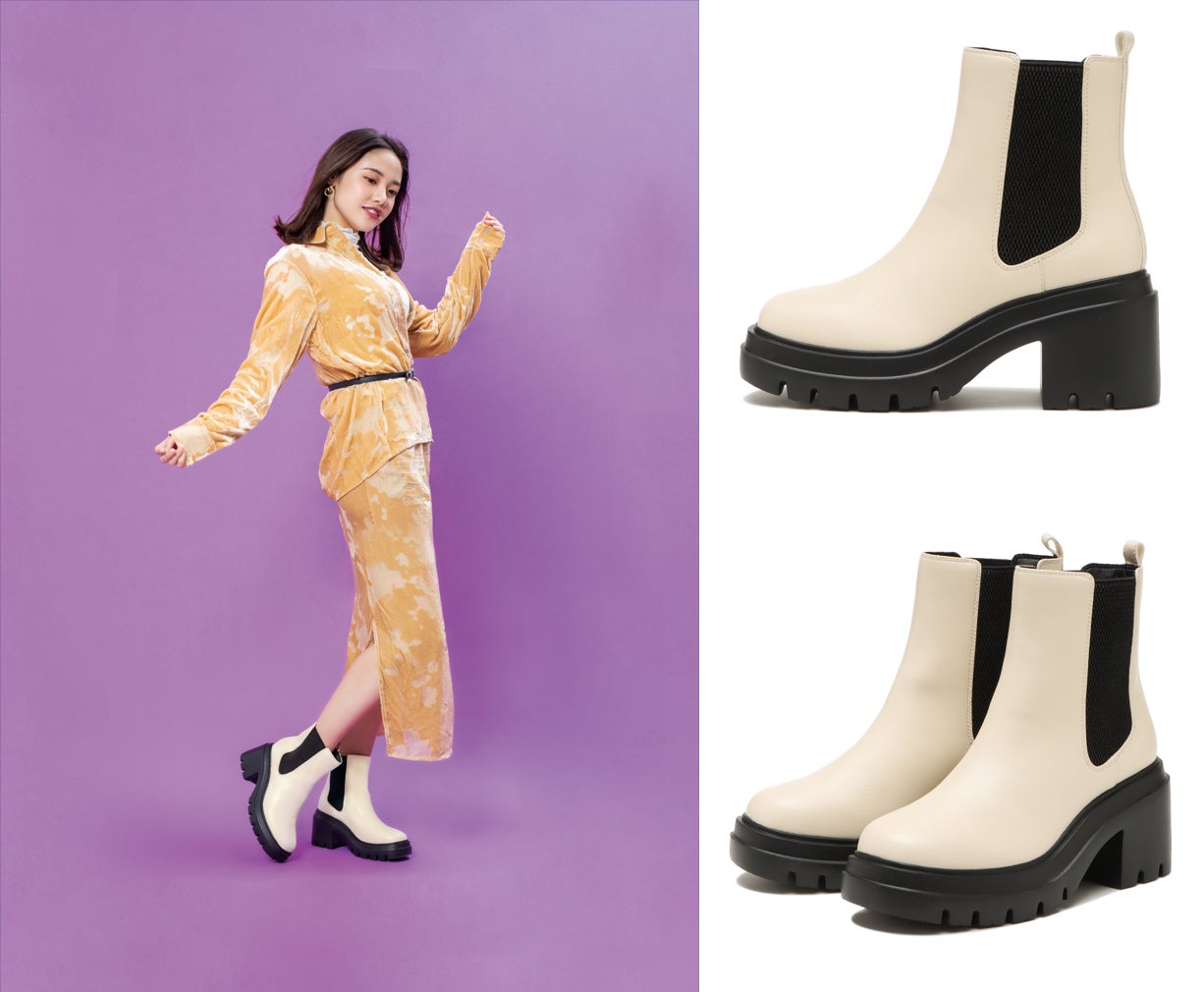 トレンド感のあるボリュームソールを使用したバックゴアブーツ。背面のゴアのストレッチが効くため、ロングブーツ特有の着用時の窮屈感を軽減しています。