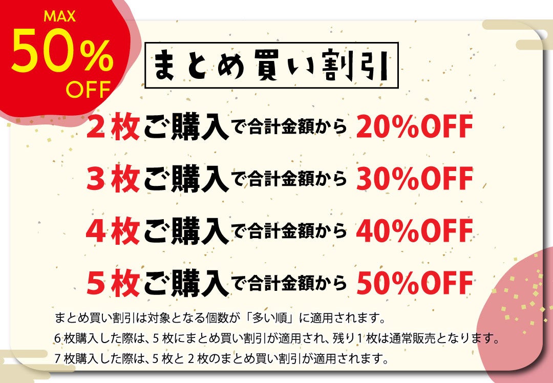 ⼀度に複数枚お買上げいただくと、枚数に応じて最大50%の割引を致します。