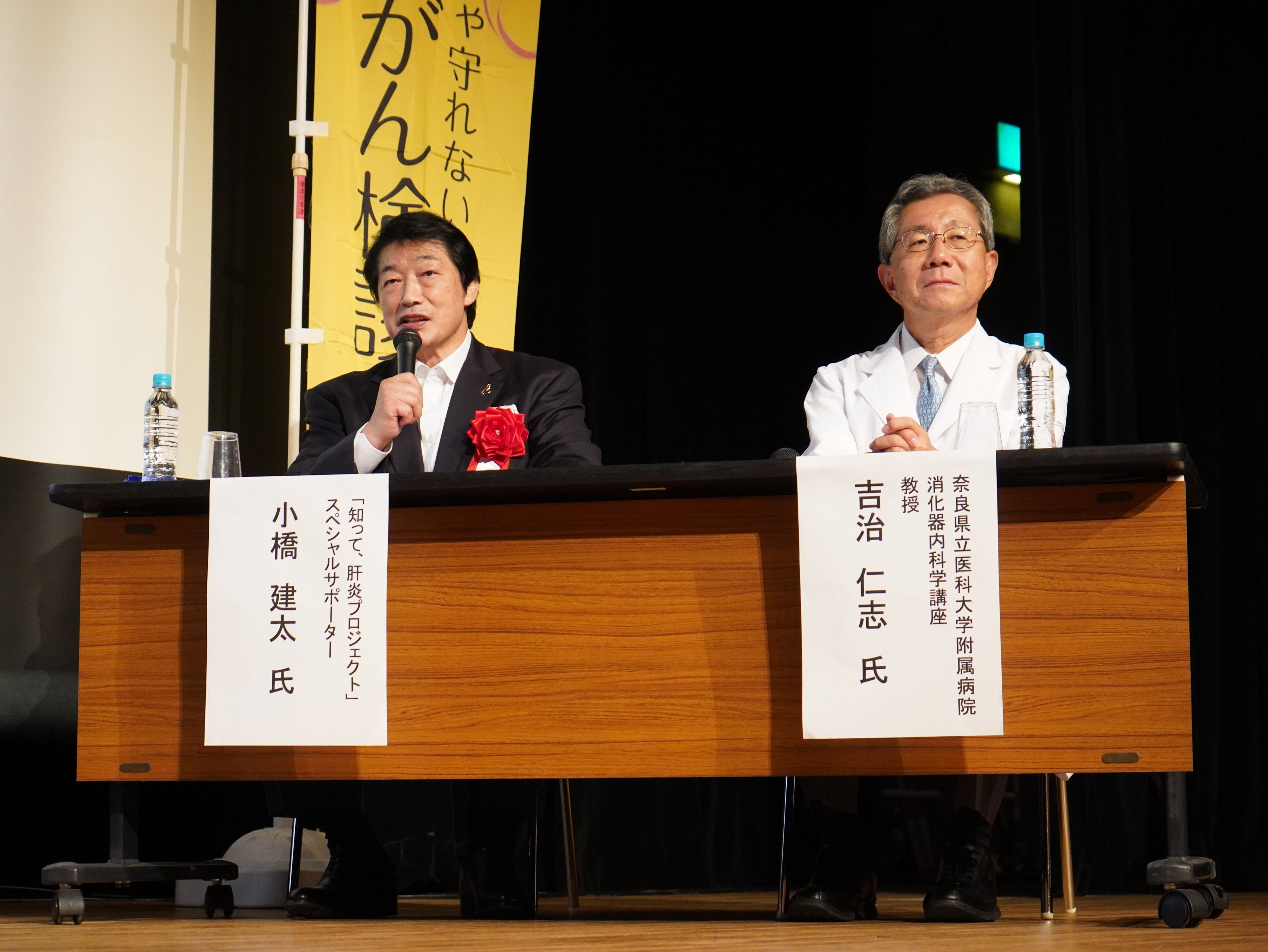 トークショーでは、吉治氏より、生活習慣が原因で発症する肝炎や脂肪肝、アルコール性肝炎のリスクについても解説がありました。「悪玉脂肪肝や過剰な飲酒は、放置すると肝硬変や肝臓がんにつながることが知られています」と指摘。特に奈良県では肝炎ウイルスの検査受診率が依然として低く、「数年前までは全国でも最下位だった」と現状を伝え、「肝炎ウイルス検査は、肝臓がんの早期発見にもつながります。ぜひ検査を受けていただきたい」と呼びかけました。