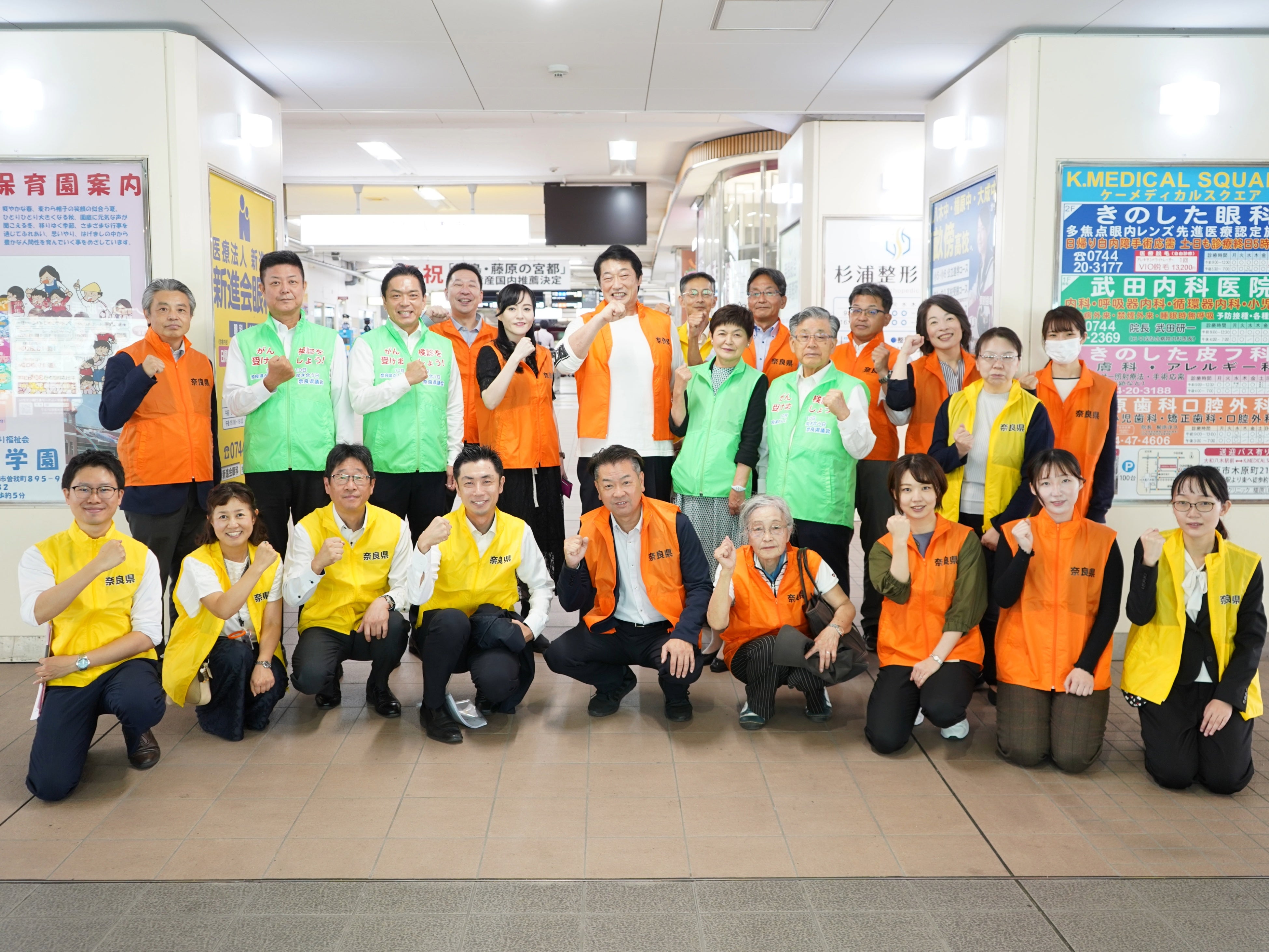 トークショーに先立ち、近鉄大和八木駅の改札前にて、小橋氏らがチラシを配布しながら、県民の皆様に対して街頭啓発を行いました。