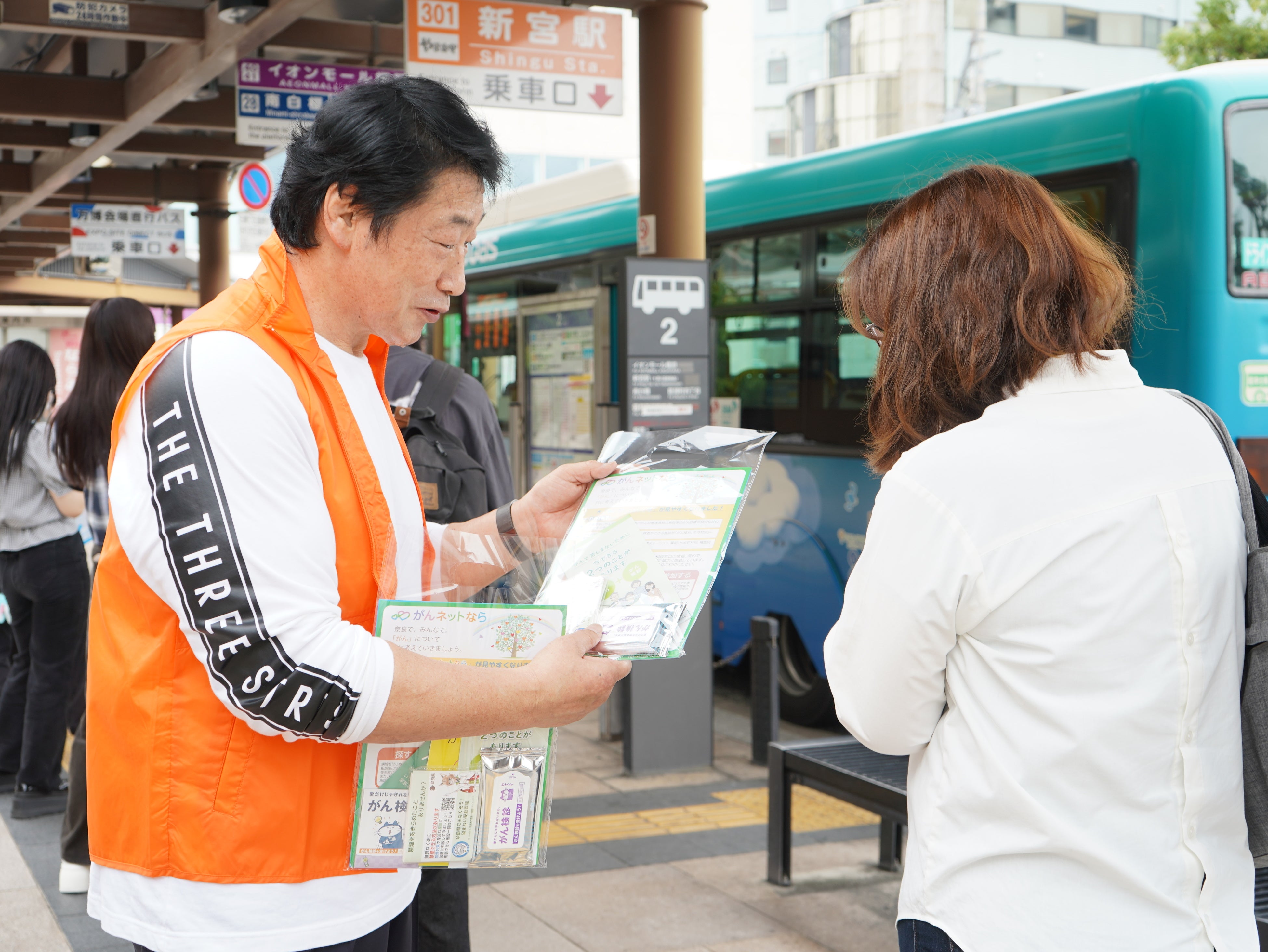 がん検診の重要性を一人でも多くの方に知っていただくため、道行く人々に直接声をかけ、受診を呼びかけました。