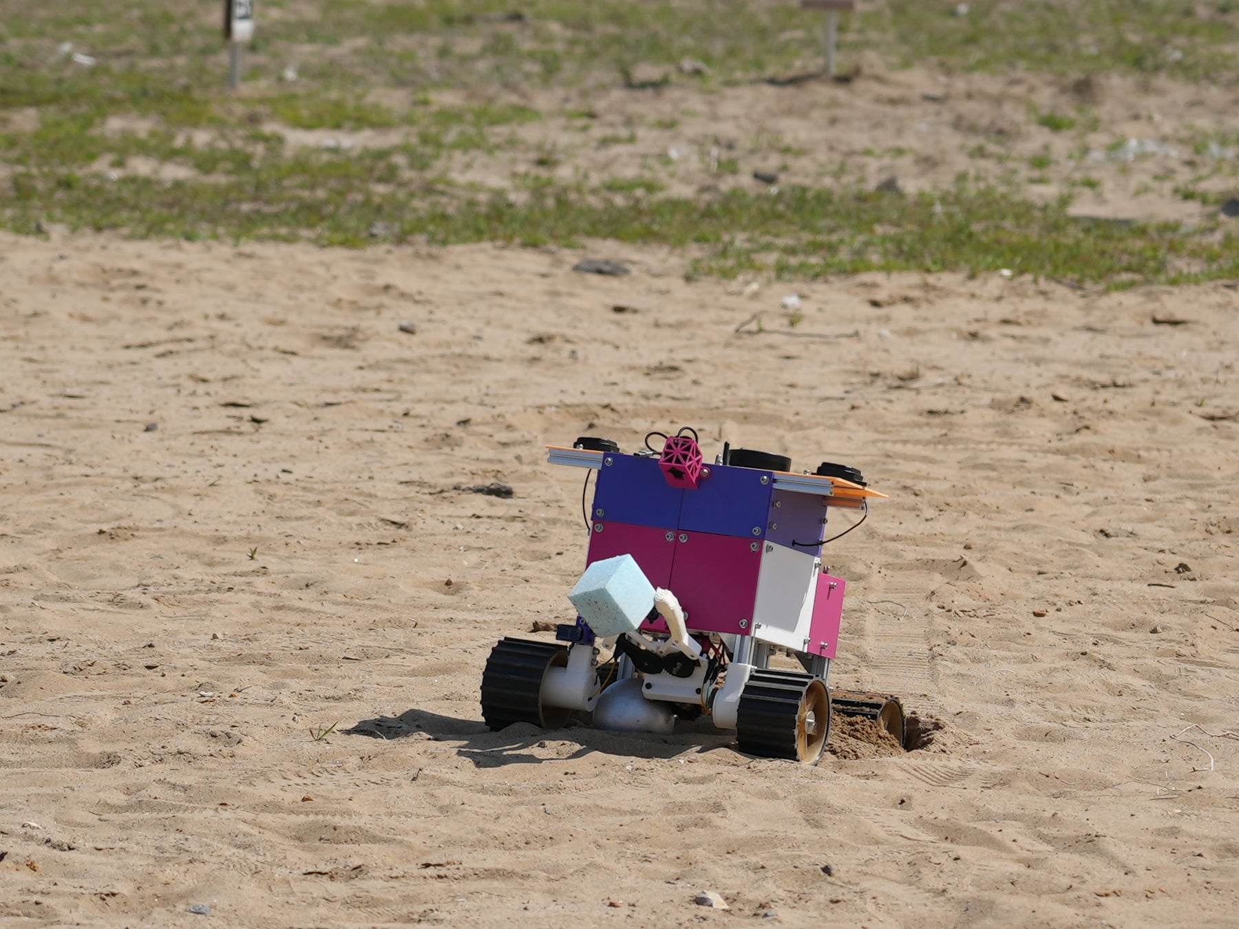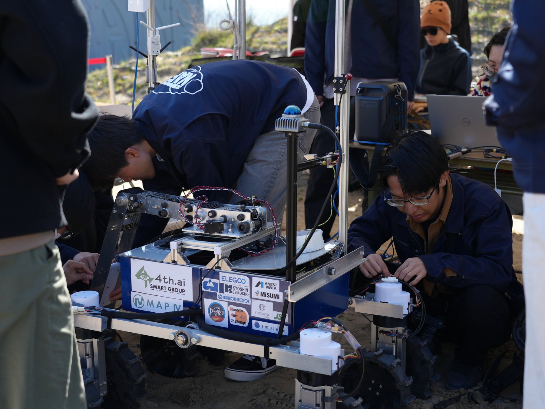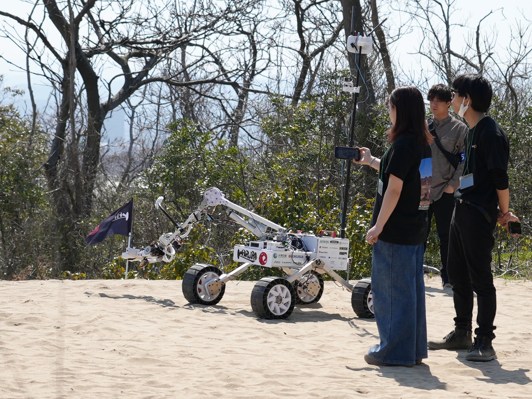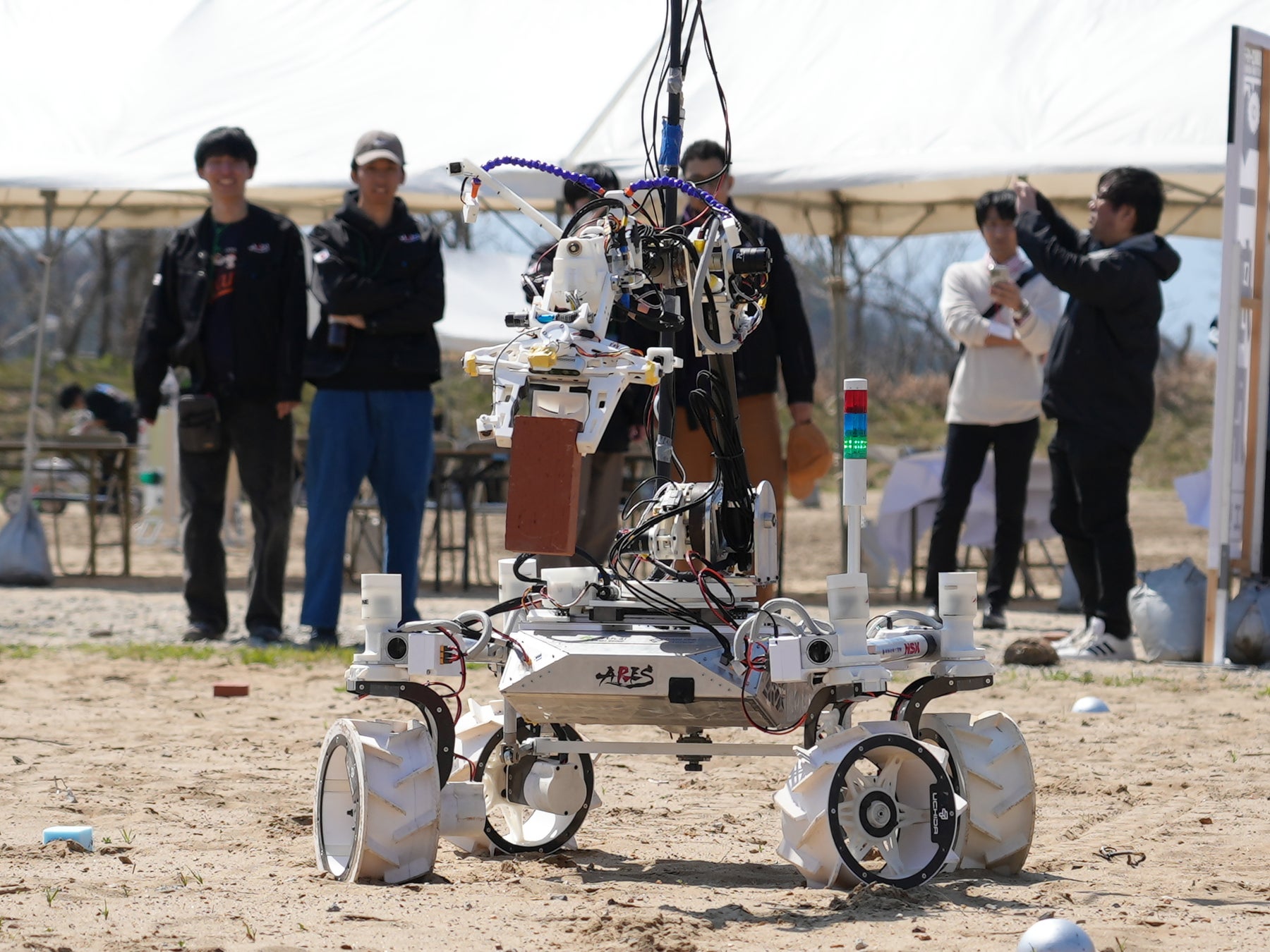 競技では、砂丘を月面に見立てて、学生たちが開発した月面探査車を走らせて障害物を避けながら走行距離を争う「自律走行」や、岩石のサンプルを採取して分析を行う「科学探査」、測量や資材運搬などを行う「無人建設」などのミッションがあり、設定されたミッションをどれだけ達成できるかを競いました。