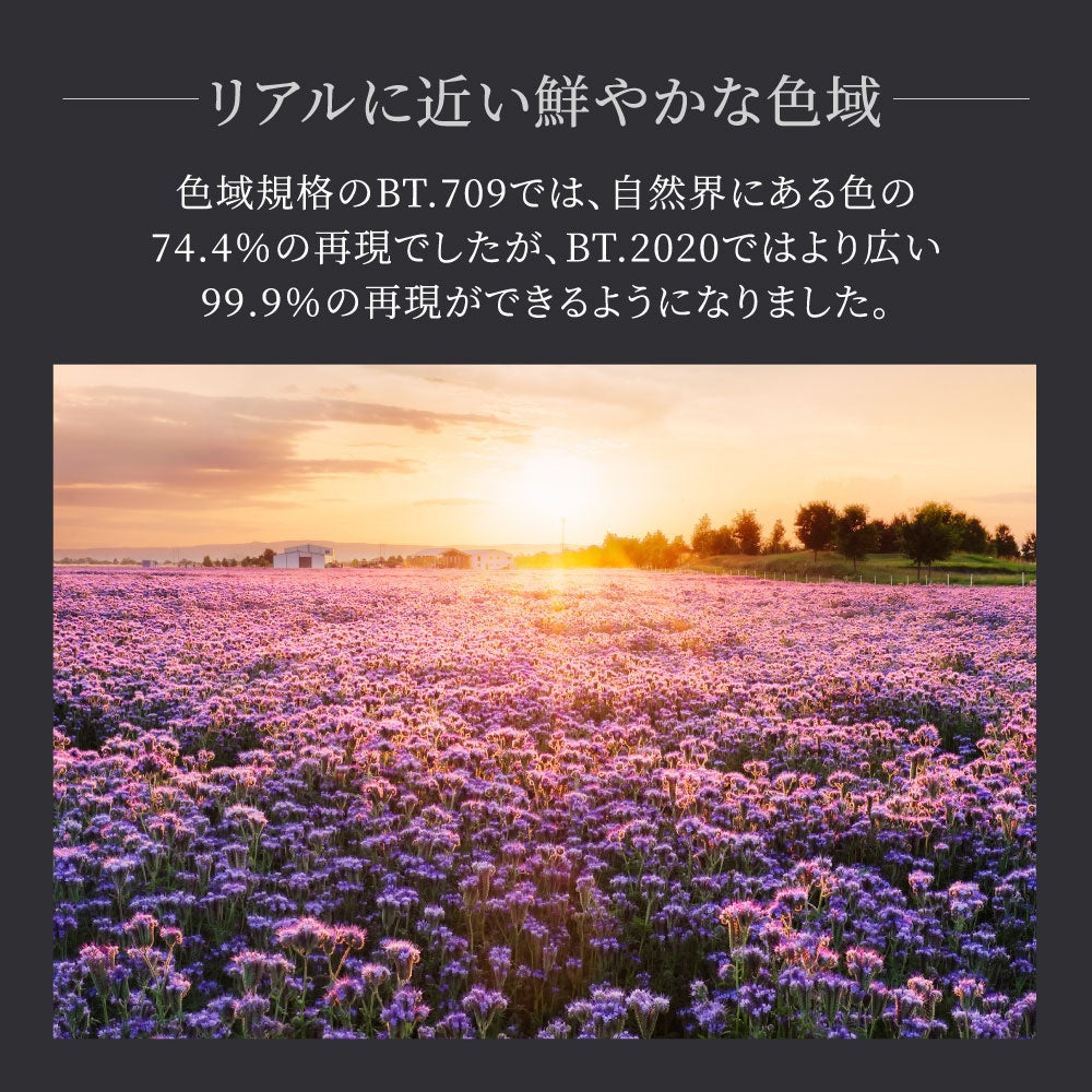 本製品は色域規格BT.2020に対応しています。これまで一般的であった色域規格BT.709では、自然界にある色の74.4%しか表現できていませんでした。BT.2020ではより広い色域をカバーしているため、リアルに近い色鮮やかな99.9%の色域を再現できるようになりました。
