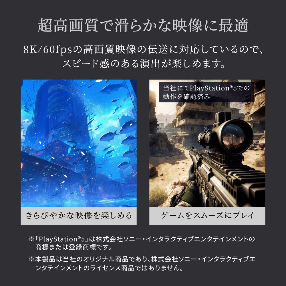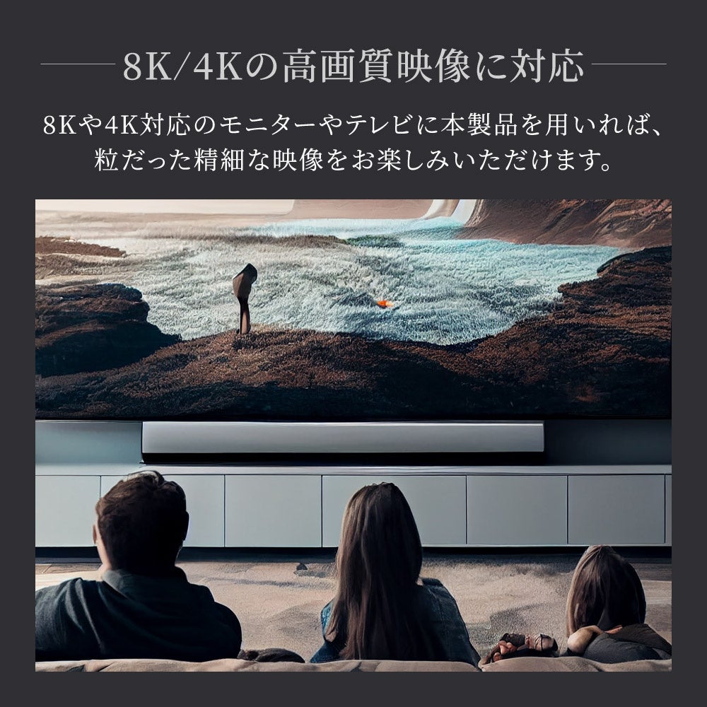 高画質テレビだけでなく、8Kや4Kに対応したモニターやパソコン、レコーダー、チューナー、ゲーム機など幅広く使える「ウルトラハイスピードHDMIケーブル」です。