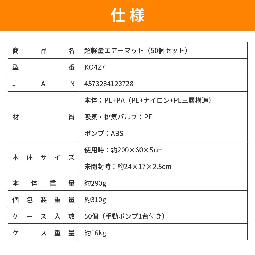 RABLISS KO427 超軽量エアーマット(50個セット)