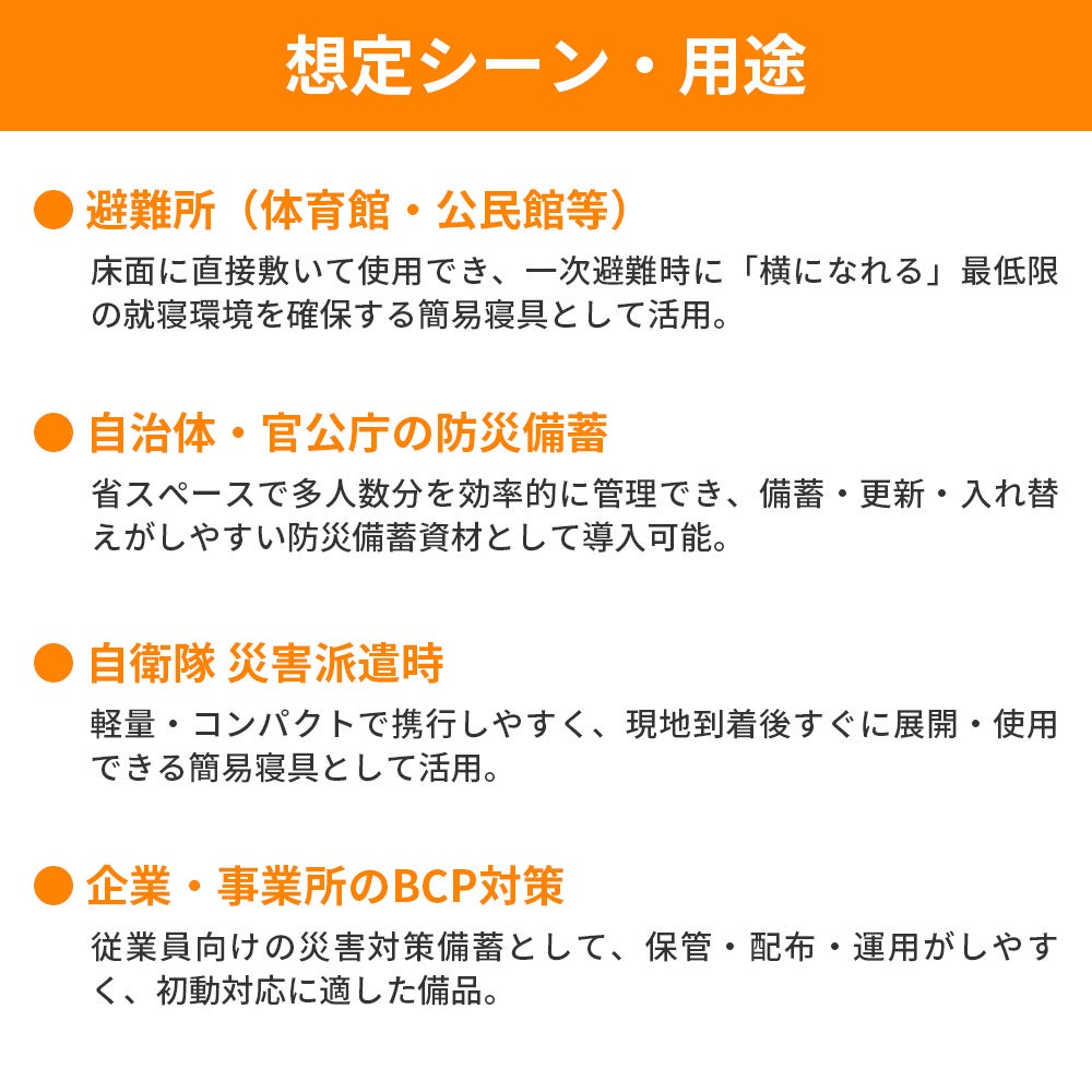 電源不要でその場ですぐに使用でき、避難所や災害時をはじめ、アウトドアなど幅広いシーンで快適な休息環境づくりをサポートします。