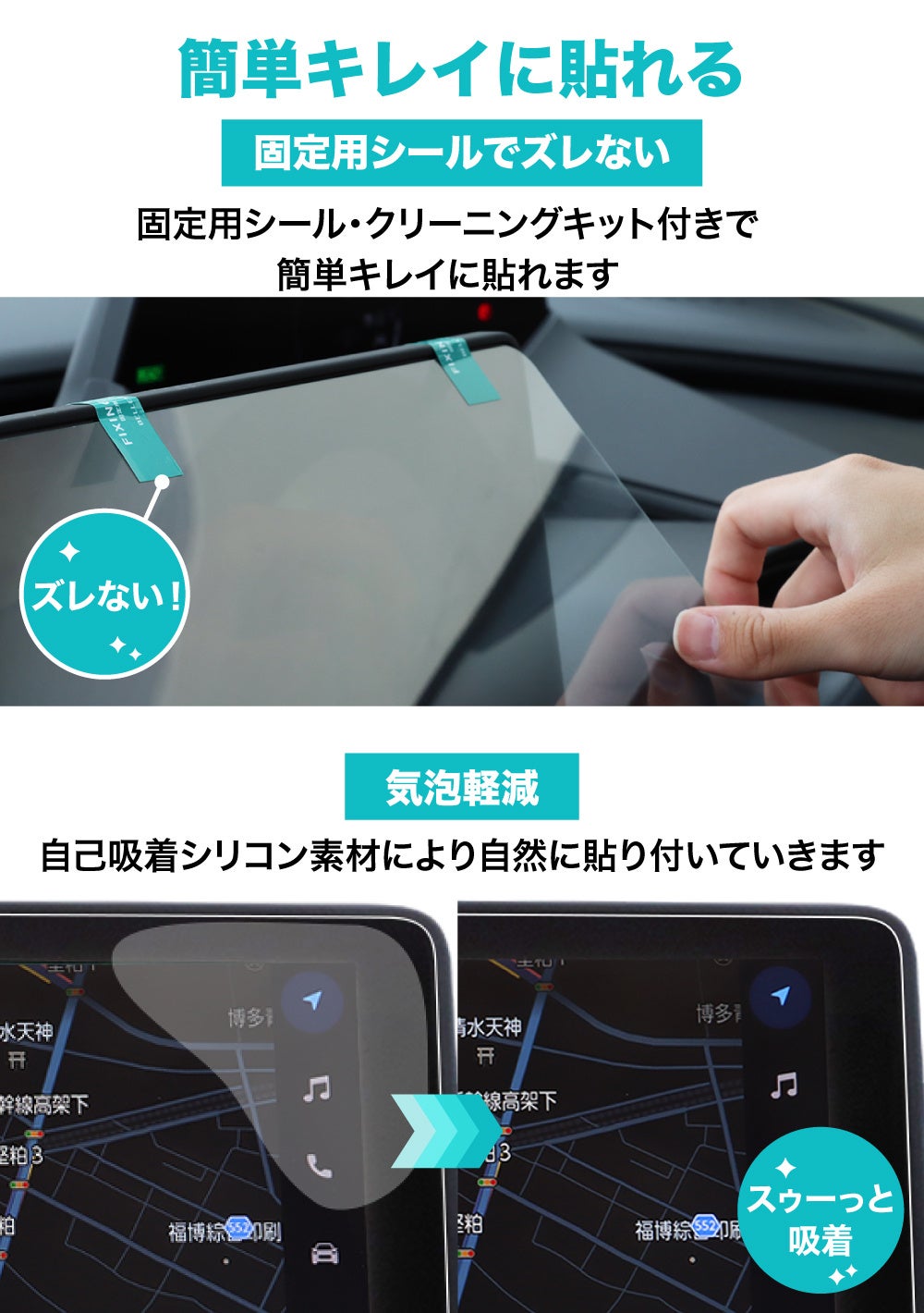 付属の固定用シールを使えば、大きなナビ画面でも位置合わせがしやすく、簡単に貼り付けが可能です。また、フィルムの粘着面には特殊シリコン素材を採用。これによりフィルムは自己吸着し、気泡は入りづらく抜けやすくなります。