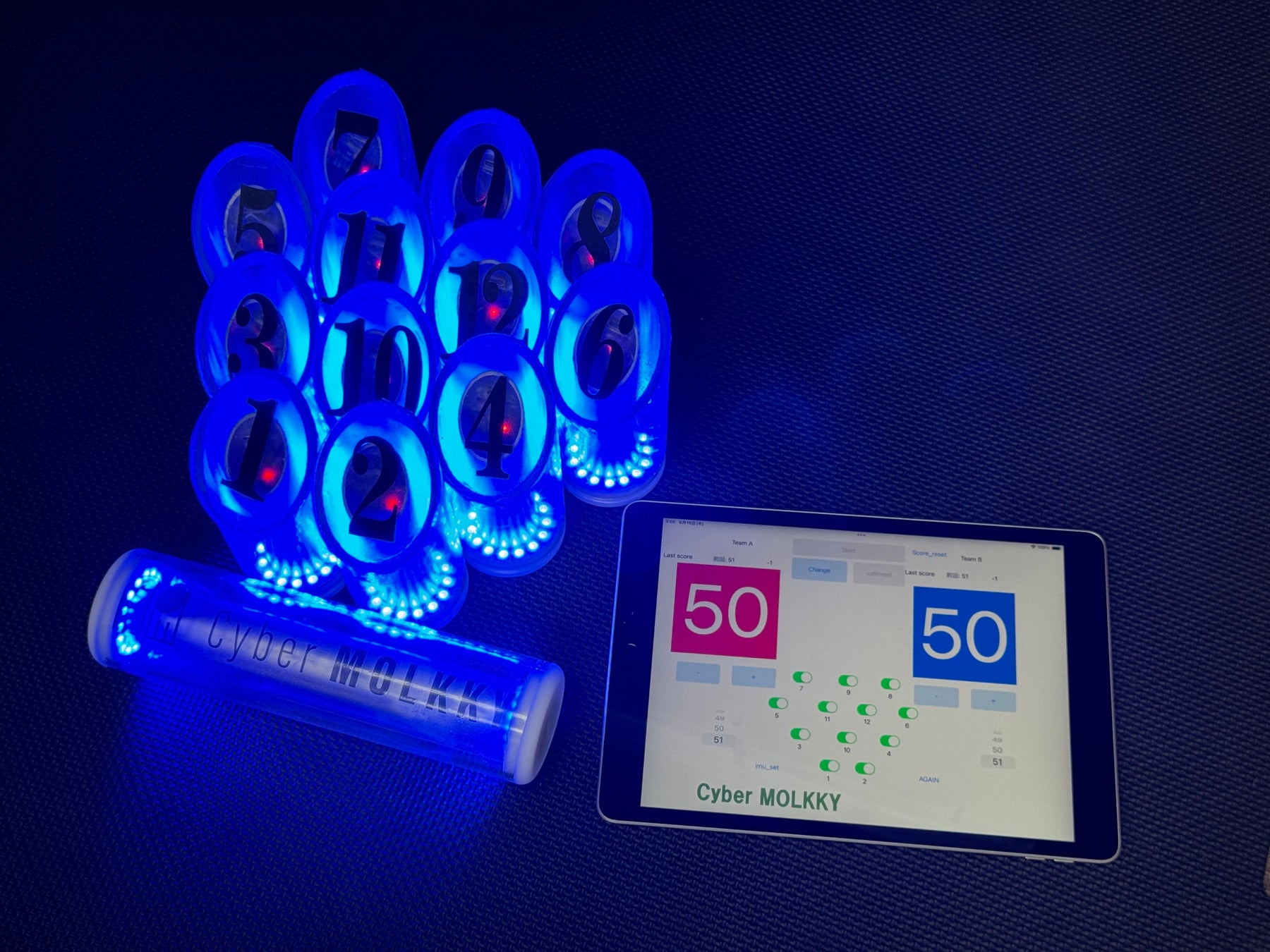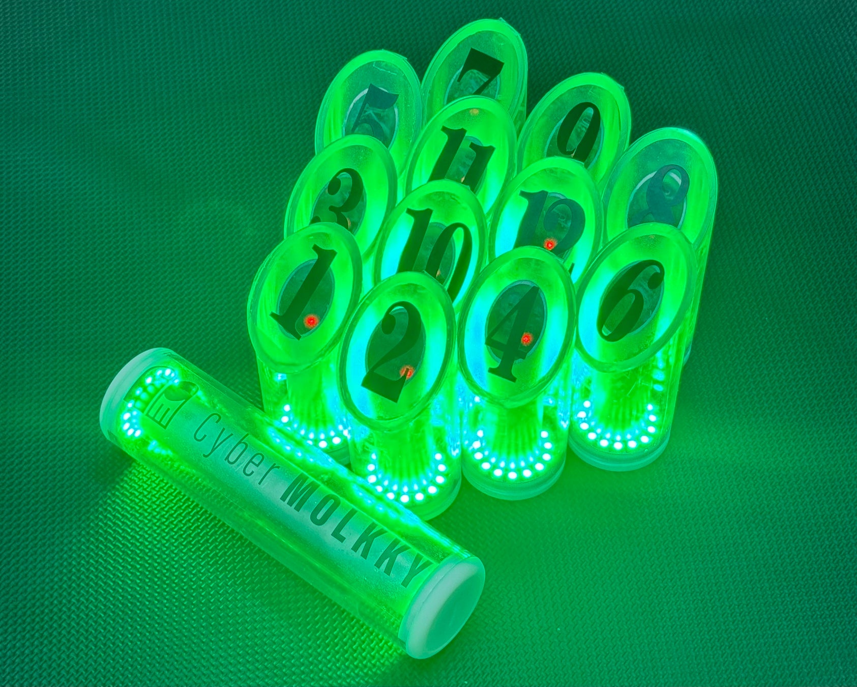 サイバーモルックは、フィンランド発祥のピン倒しスポーツ「モルック」を、現代のデジタル技術で進化させた次世代ニュースポーツです。対象となる12本のスキットル(倒すピン)と、投擲用のピンすべてにセンサーとLEDを内蔵し、完全自動判定・即時スコア計算・演出連動を実現しています。
