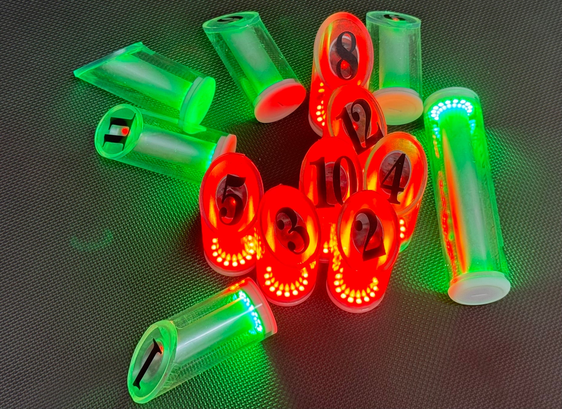 ・ピンは透明なポリカーボネート製で、耐久性と光の透過性を兼ね備え、LED演出を最大限に引き立てます