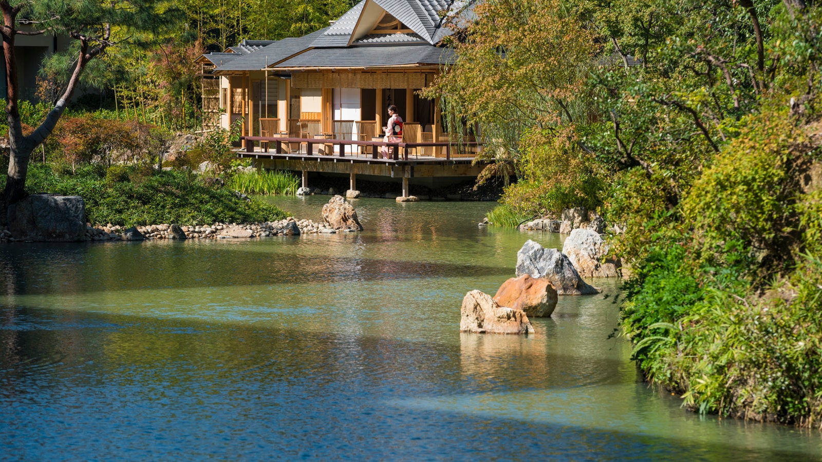 京都出身の建築家・山本良介氏によってデザインされた茶室は、京都産の檜が主に使用され、釘を使わずに建てられた日本文化と匠の技の結晶といえます。内部は「楓樹」と「積翠亭」という、2つの特別な空間によって構成されていますが、どちらもガラス張りの室内から日本画の世界のような 800年の歴史ある池庭を望む特等席です。