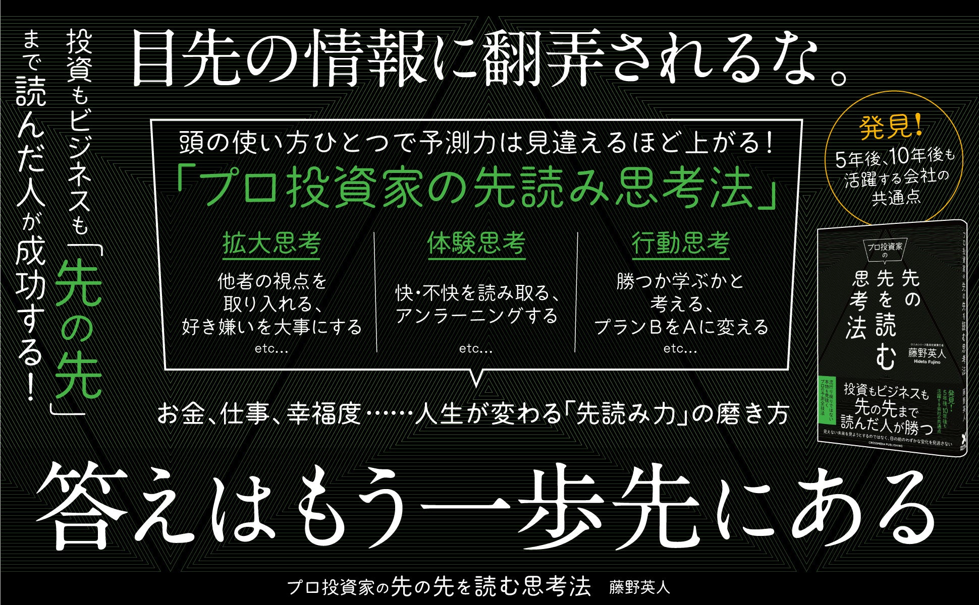 本書では、「先の先」を読む思考力について、ファンドマネージャーとして32年以上の投資歴を重ねてきた、藤野氏の見方や考え方をご紹介します。