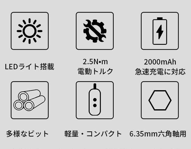 ※トルクとは回転軸を回転させる力のことで、数値が大きいほどネジを締める・緩めることが簡単になります。