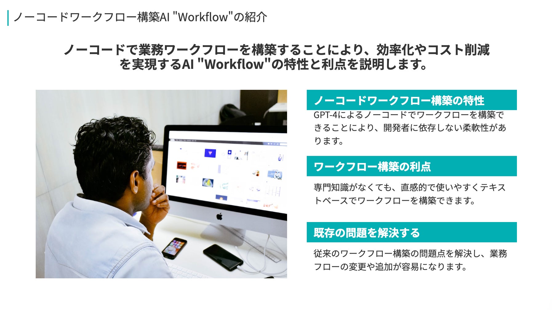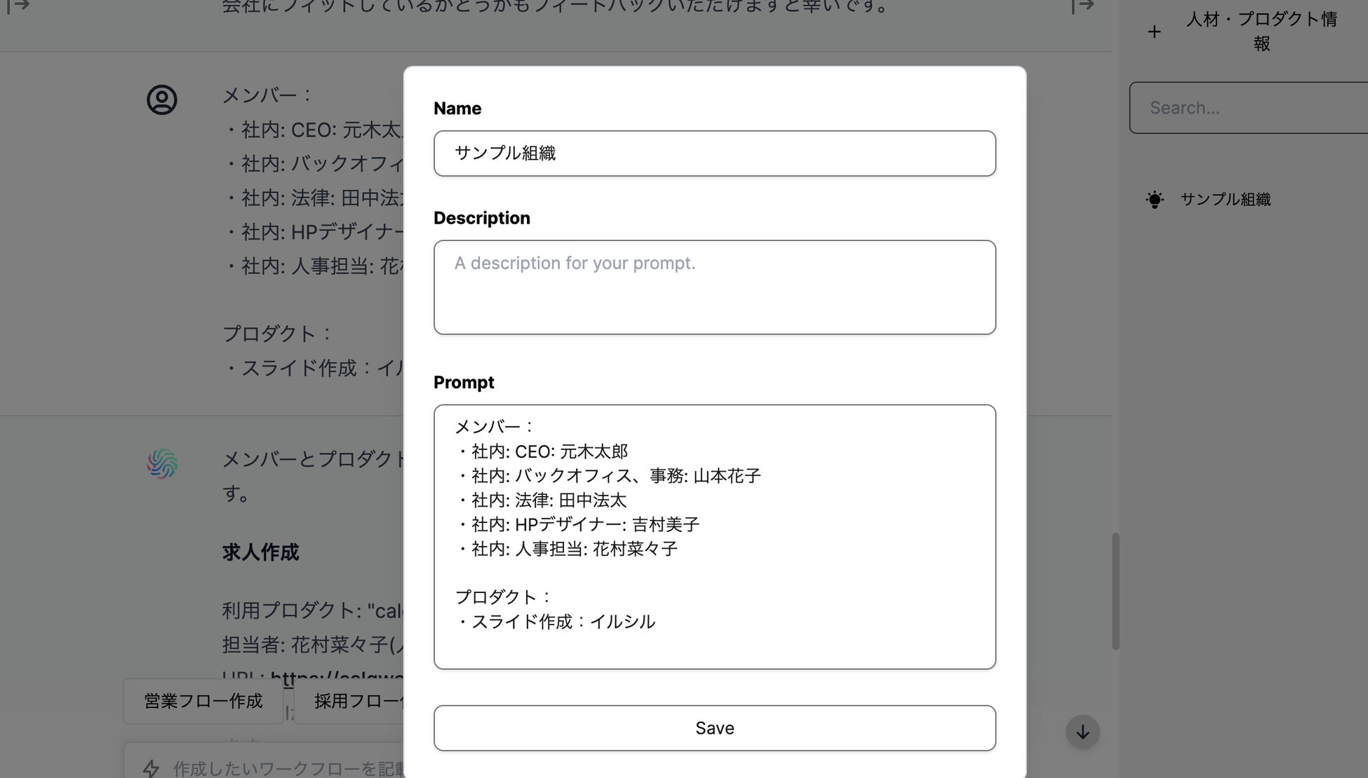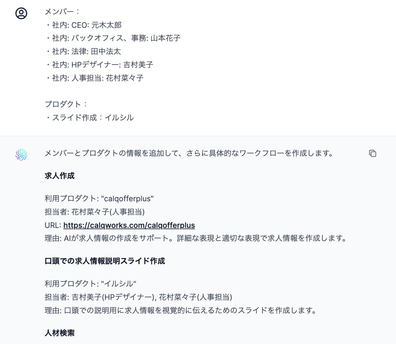 社内情報をAIに提供すると、アサインメンバーや利用プロダクトも盛り込んだ上でワークフローを記述します。
