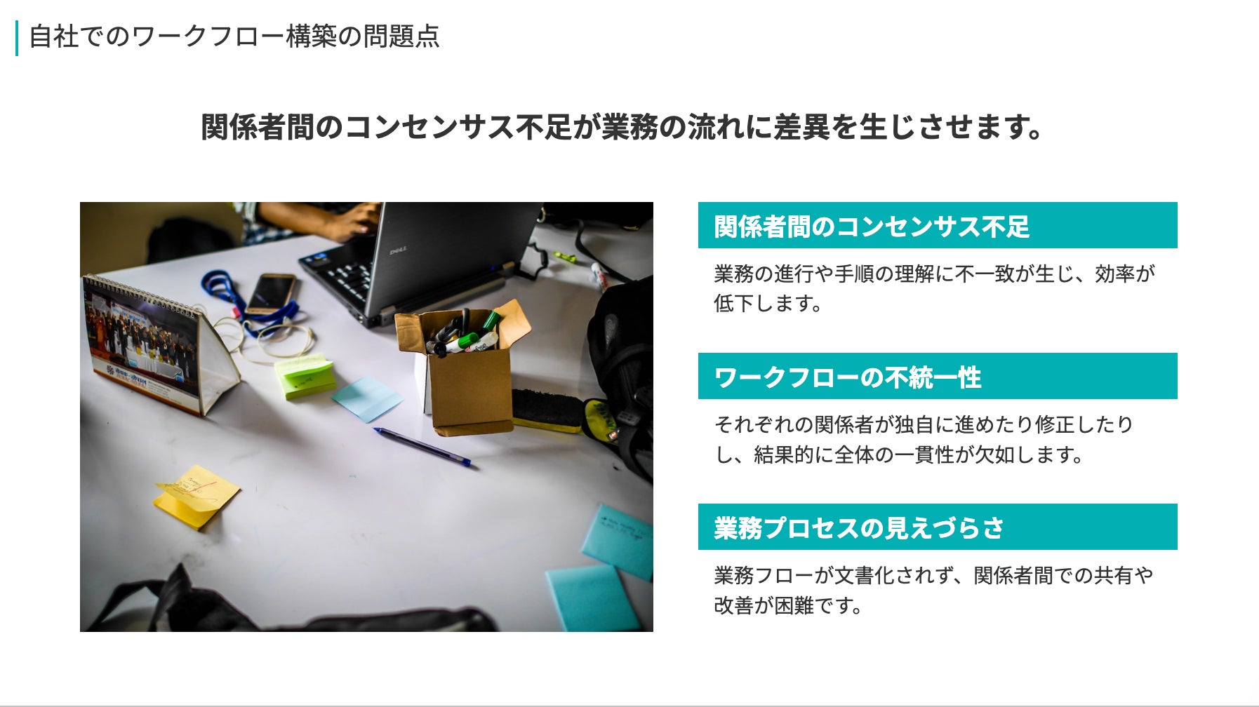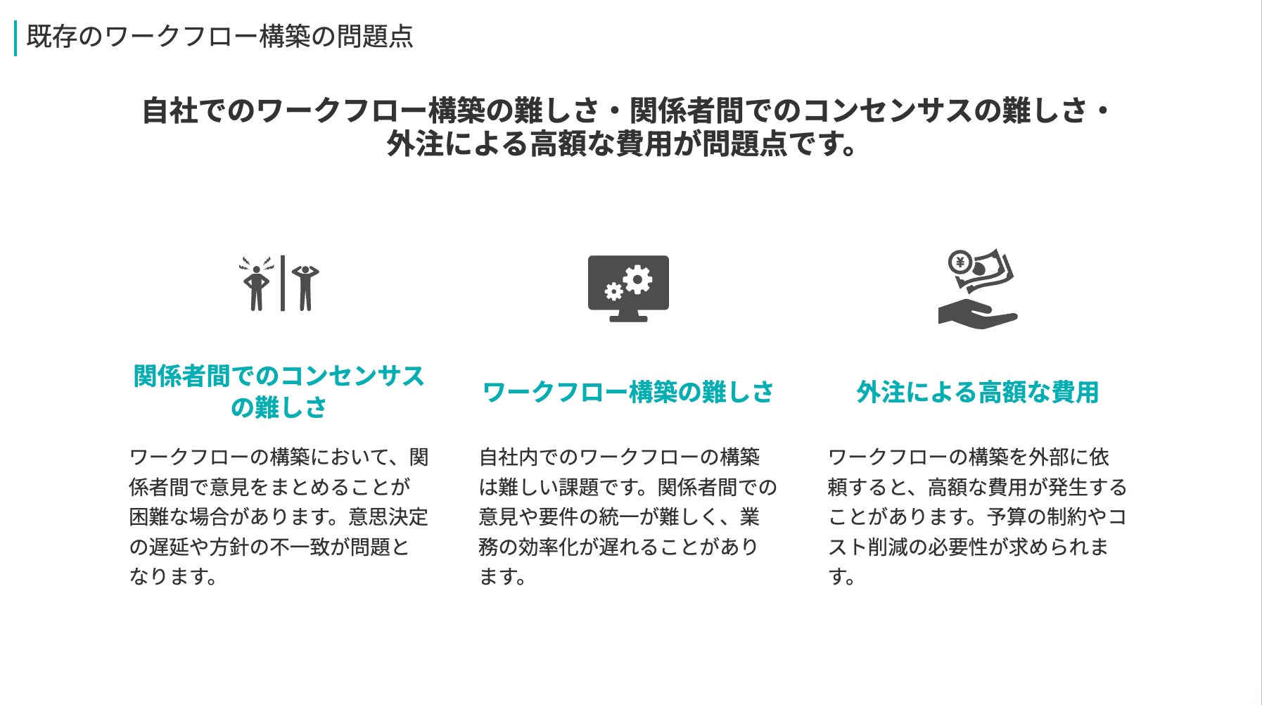 「共創の基盤を創る」をミッションに、人々の働き方をAIと量子コンピューター技術で変革する株式会社KandaQuantumは、これまで多くの人手で行っていた業務ワークフロー構築をAIがサポートするノーコードワークフロー構築AI "Workflow" を新たにリリースしました。既存のワークフロー構築は自社で行おうとすると関係者がコンセンサスが取れない問題や、外注すると高額な費用がかかる問題などがありました。この度CalqWorksの提案するワークフローAIはこれらの問題を解消し、様々な業務ワークフローを効率化します。また、業務フローの開発においても要件定義の段階で活用することも可能とします。