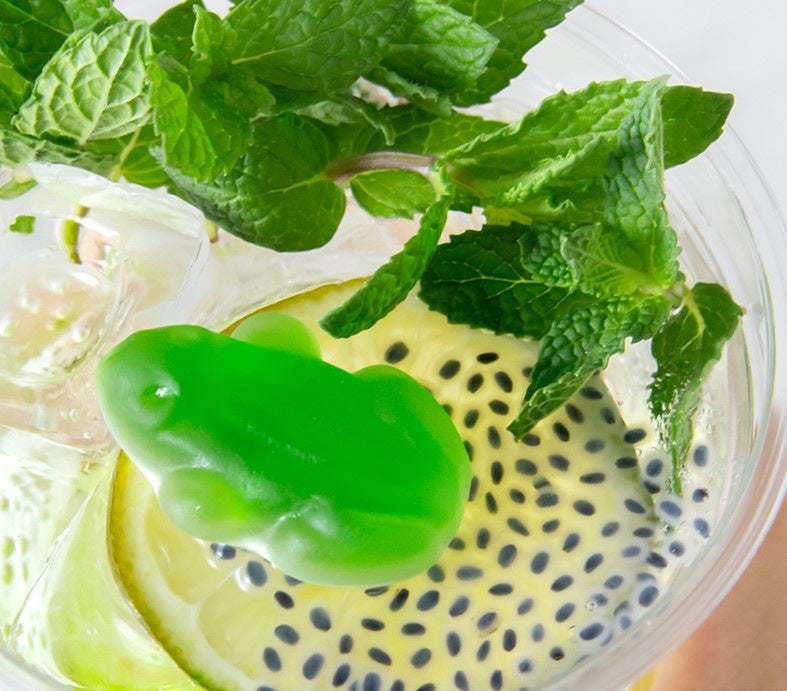 つぶつぶ感が特徴の「バジルシード」で「カエルの卵」をリアルに表現したところがポイント!ライムの上にちょこんと乗った「カエルグミ」も食べられます。
