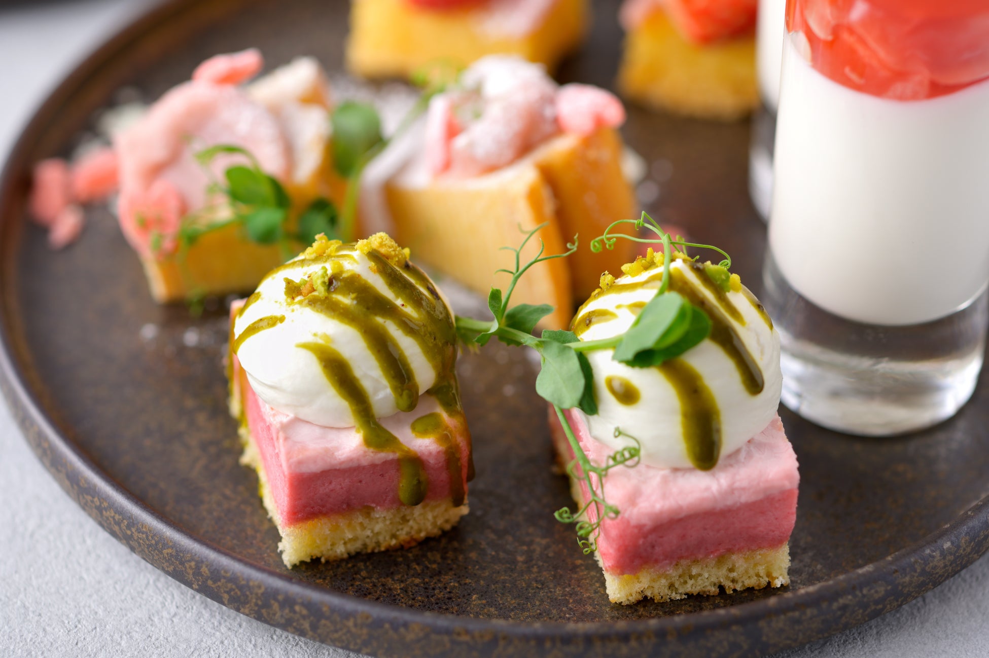 豊洲36階の開放的な空間でティータイムをお過ごしいただく贅沢時間。桜やいちごから連想されるピンク色を引き立たされるグリーンを配置することで芽吹きの春をイメージした「苺のムースピスタチオのソース」や、満開の桜を思わせる「苺と桜のタルト」など春に相応しい色鮮やかで華やかなスイーツや、旬の食材を使用したセイボリーをご用意しております。時間帯によって表情を変えるベイエリアの美しい景色とともに、桜と春の訪れをご堪能ください。