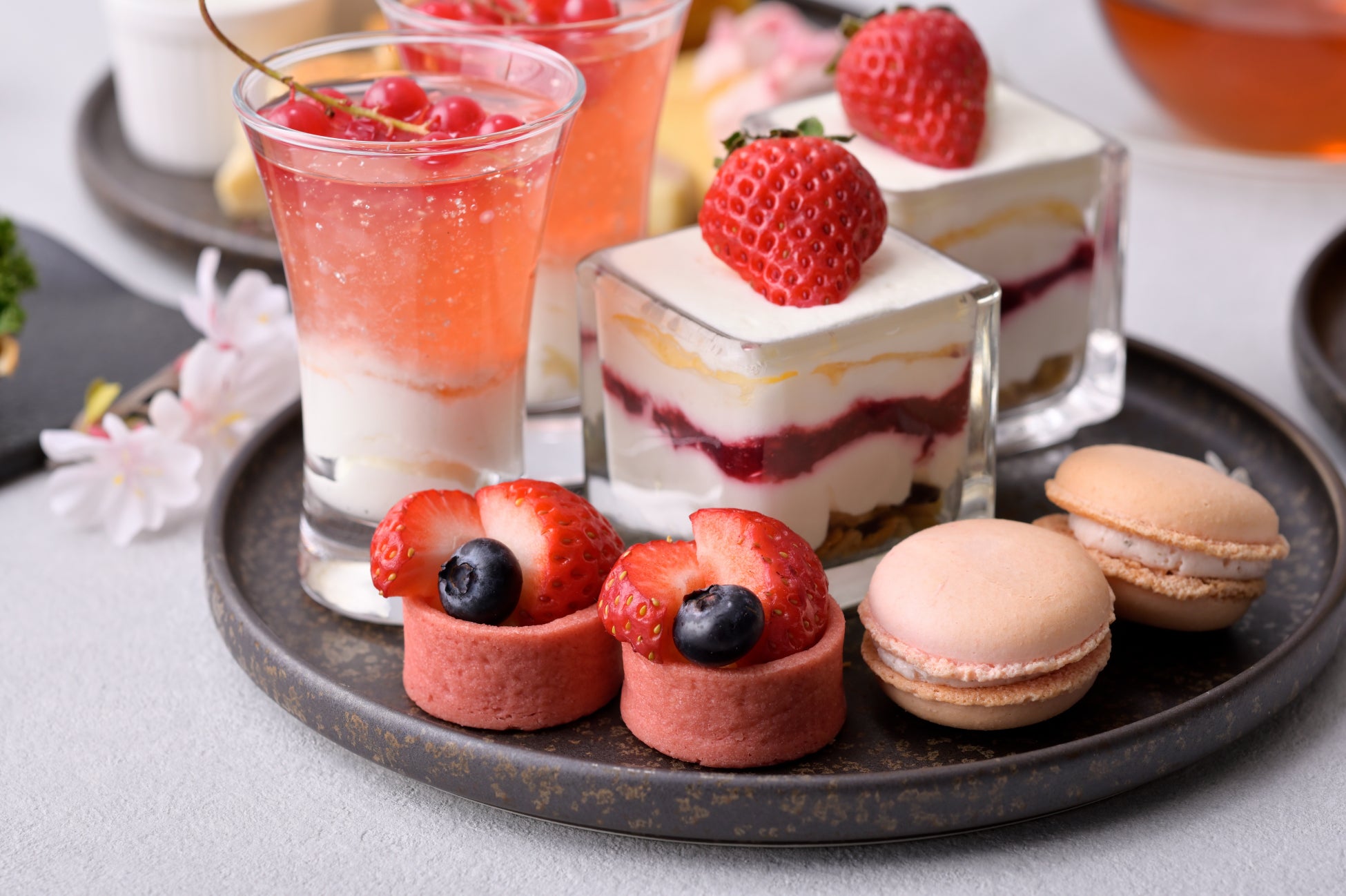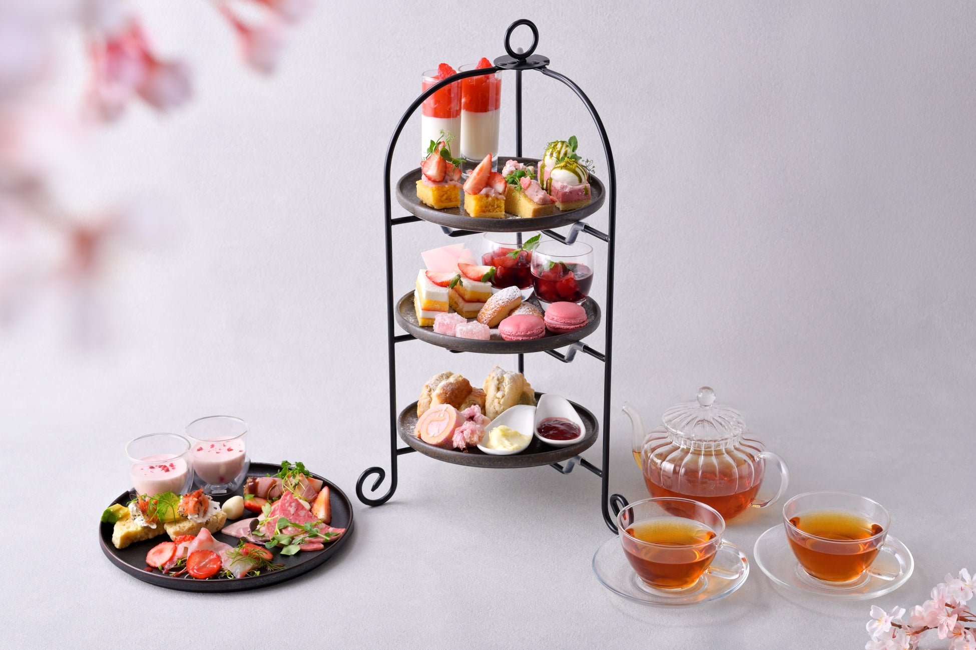 春らしい優しい色合いに包まれたスイーツとセイボリーが並びます。旬のいちごと桜をふんだんに使用したアフタヌーンティーでお花見気分をお楽しみください。