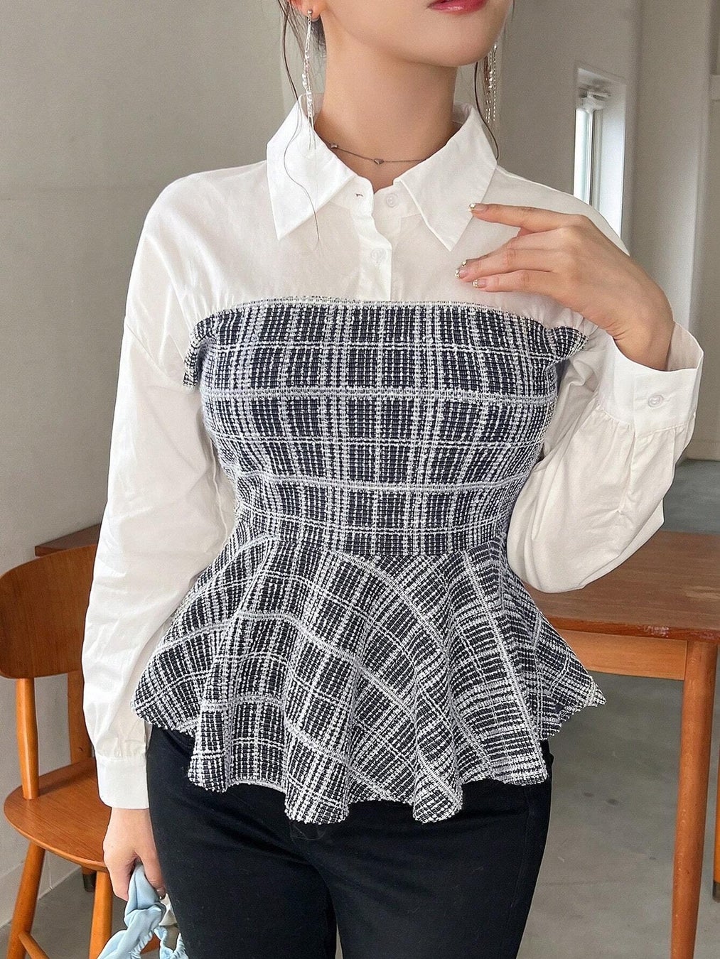 商品名:FRIFUL ウィメンズ チェック柄 ラッフル シャツ
