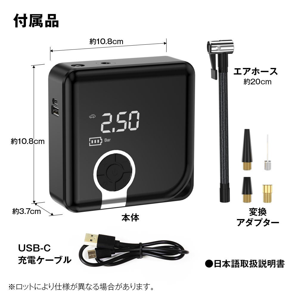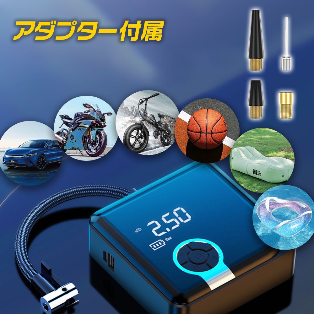 各種アダプター付属でボールや時点書タイヤなど車以外にも使用できます。