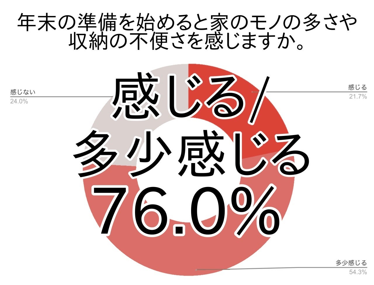 今回のアンケートでは、年末の準備を始めると家のモノの多さや収納の不便さを感じる/多少感じると答えた方は約8割(関東76.0%・全国78.3%)でした。