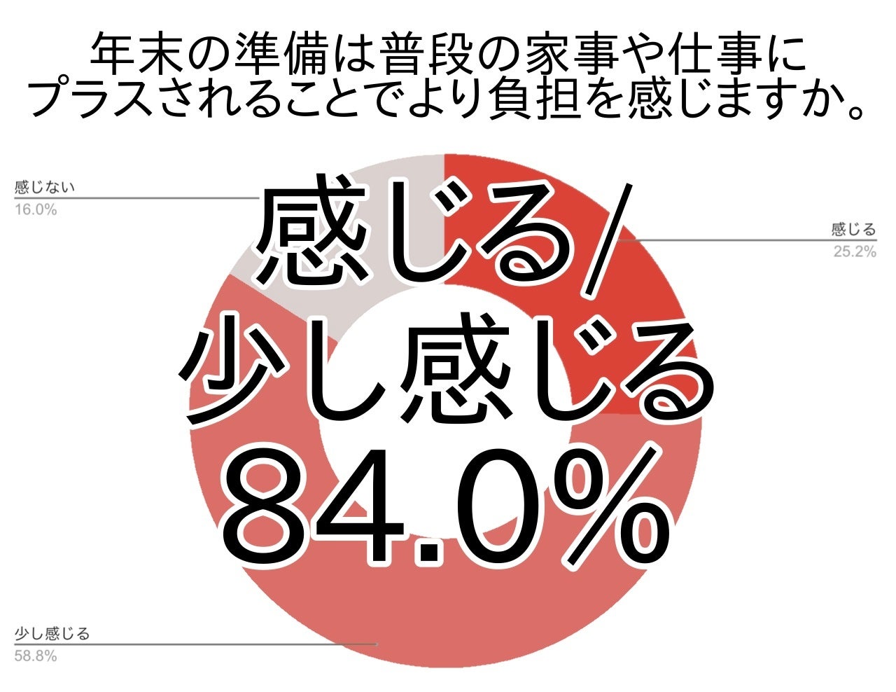 今回のアンケートでは、年末の準備は普段の家事や仕事にプラスされることでより負担を感じる/少し感じると答えた方は約8割(関東84.0%・全国82.9%)でした。