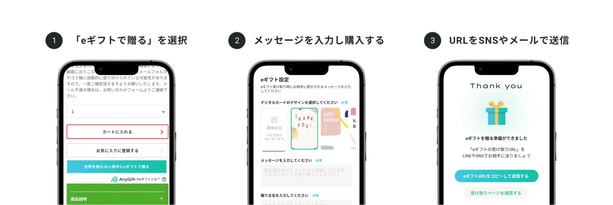 AnyGiftは、相手の住所を知らなくてもLINEやメールで贈ることができる"eギフト機能"を、ECサイトに組み込むことができるサービスです。