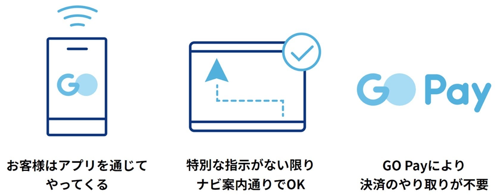 ②『GO』からの目的地入力済みアプリ注文で、原則ナビ案内通りに走行すればよいので安心。