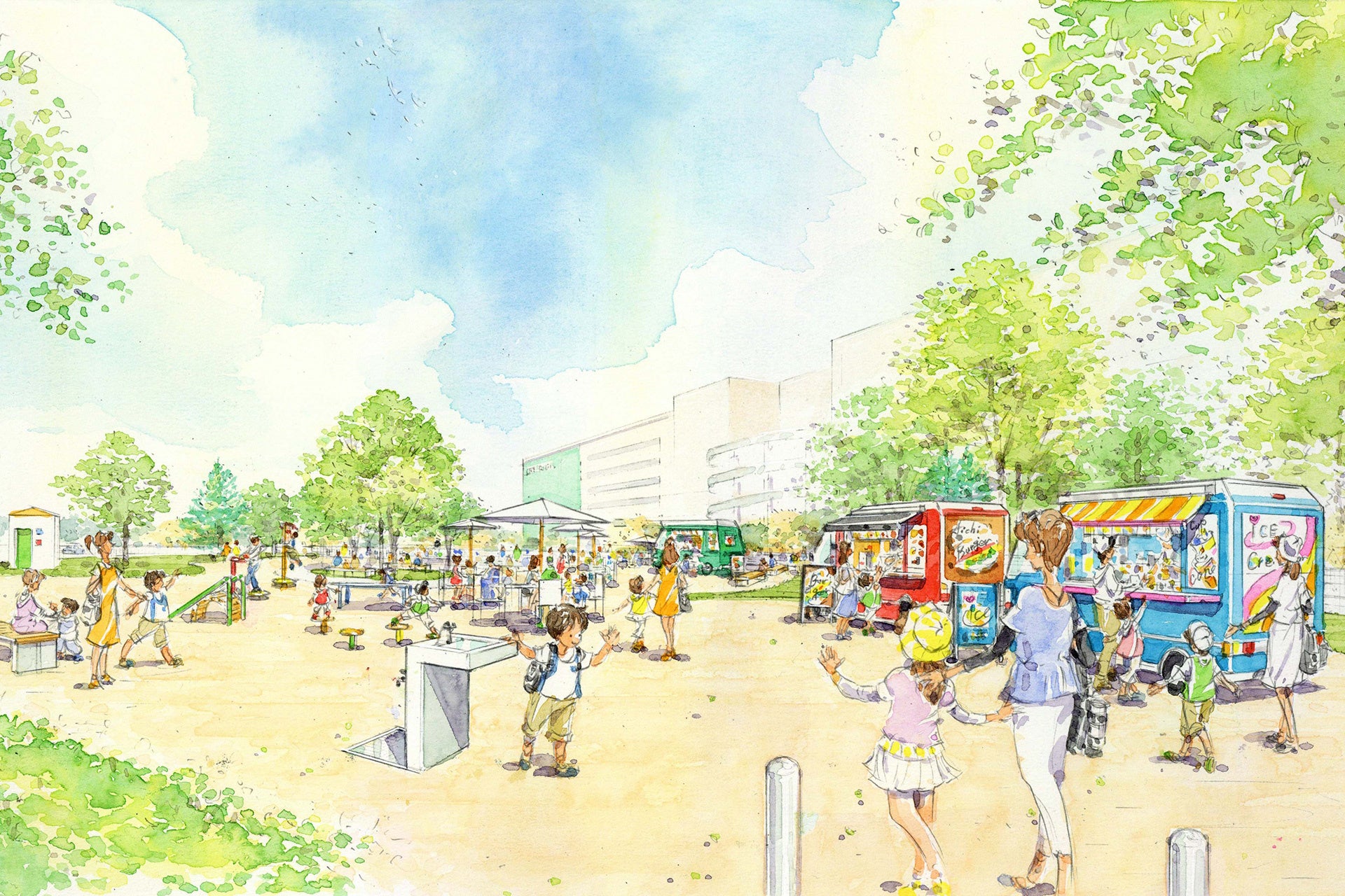 プロロジスは施設の敷地内に、イベントなどに活用でき近隣住民の憩いの場となる広場の整備を予定しており、周辺企業と連携して地域に賑わいを生む施策を検討しています。