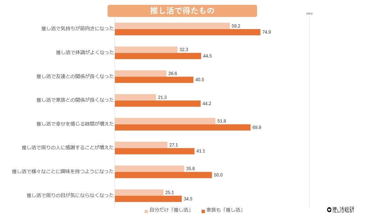 推し活で得たものについて聞いたところ、家族推し活をしている人では「前向きになれた」が74.9%、「しあわせを感じる時間が増えた」が69.9%と非常に高い結果に。