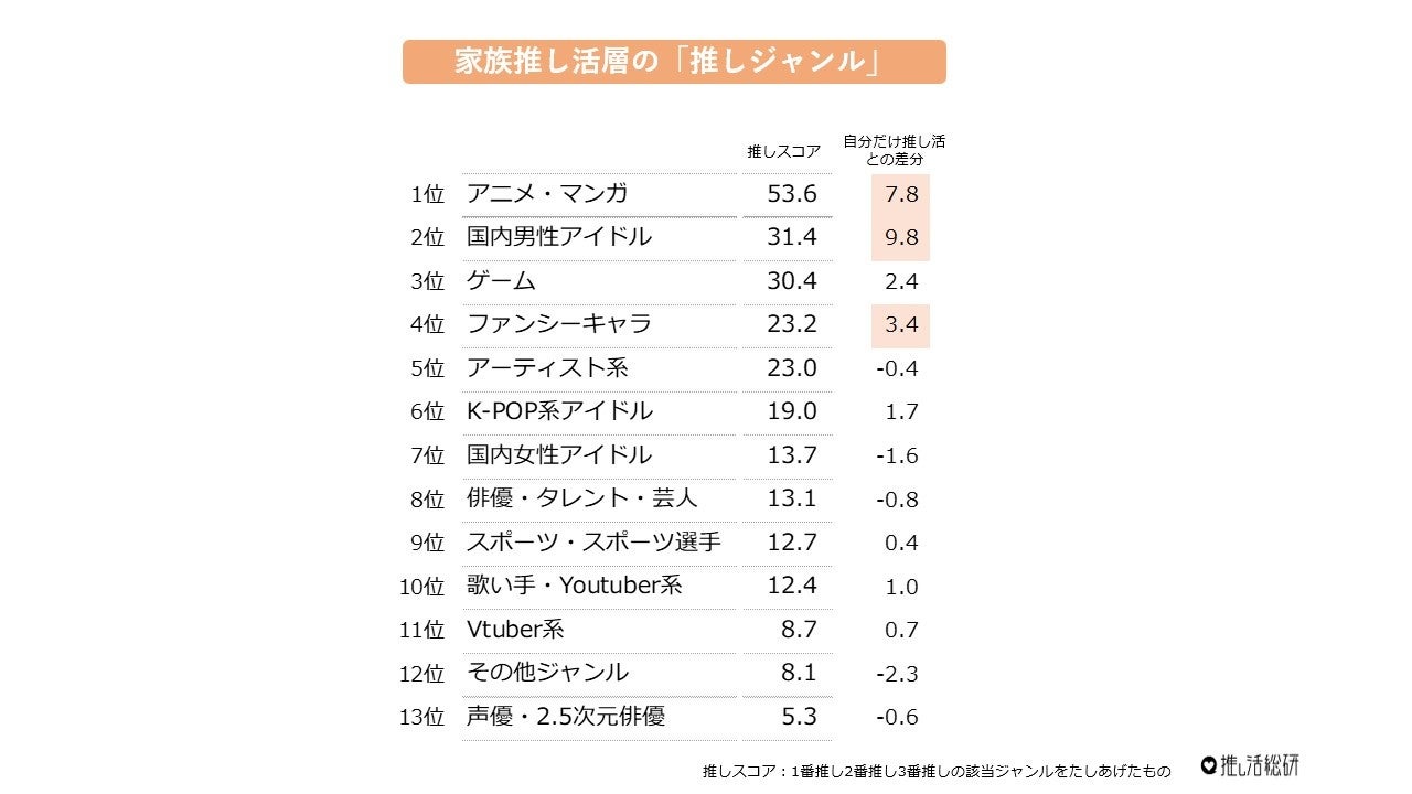 家族で推し活をしている層で顕著に多い推しジャンルは、「アニメ・マンガ」「国内男性アイドル」「ファンシーキャラ」(サンリオ・ちいかわ・ディズニーなど)。