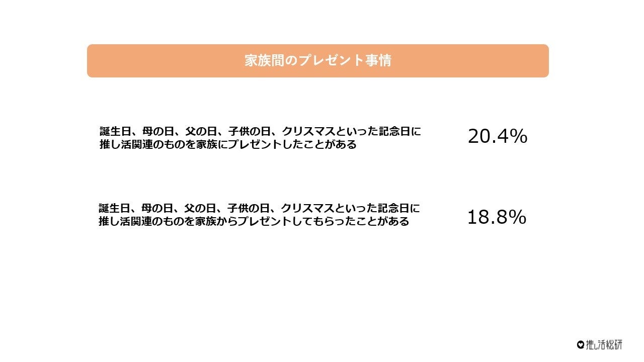 家族同士の誕生日や記念日に「推し関連のもの」をあげた・もらったことがある人は、家族推し活をしている人の約2割。割合はまだまだ大きくないですが、プレゼント選びの新たな基準として、今後のプレゼント市場の動向に影響を与える可能性があります。