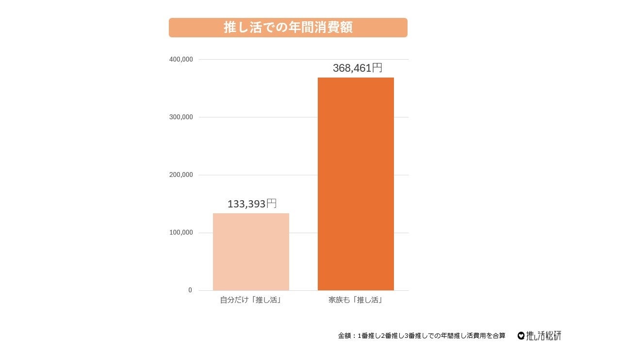 家族推し活で興味深いのが、推し活に対する消費額の大きさ。家族で推し活をしている人の年間消費金額は368,461円。これは自分だけが推し活をしている人の年間消費金額133,393円の2.8倍と両者の差が大きくなっています。