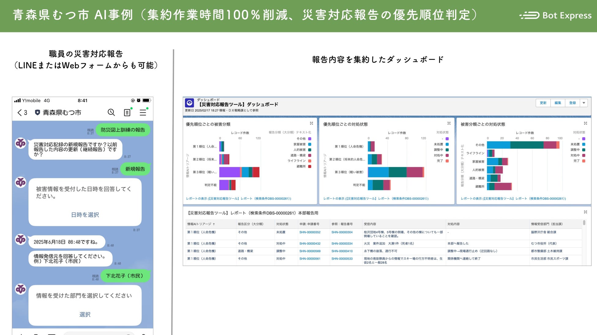 青森県むつ市からは、防災図上演習における情報集約作業を自動化し、これまで情報統括班の職員が訓練中にExcelデータをコピー&ペーストして行っていた統合作業を完全に廃止するとともに、AIによる災害対応の優先順位を自動判定することで業務効率化を実現した事例をご紹介します。