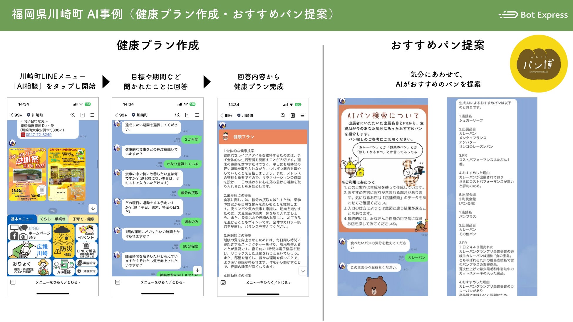 福岡県川崎町からは、AIが住民一人ひとりに合わせて健康プランを作成したり、町のパンイベントで「おすすめのパン」を提案したりといった、住民サービス向けAI活用の事例を紹介。