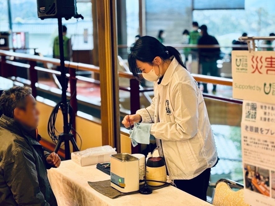 また、パソコン作業や読書、裁縫などの近距離の焦点がぼやけてしまう方の生活に欠かせないアイテムである老眼鏡を能登半島地震により破損・紛失するなどして不便な思いをされている方々の一助となればと、二次避難所「山城温泉みやびの宿 加賀百万石」(石川県加賀市)にて日本リザルツが行った老眼鏡の無償配布に参加。老眼鏡の無償提供に加え、メガネの修理・調整、クリーニングを行いました。