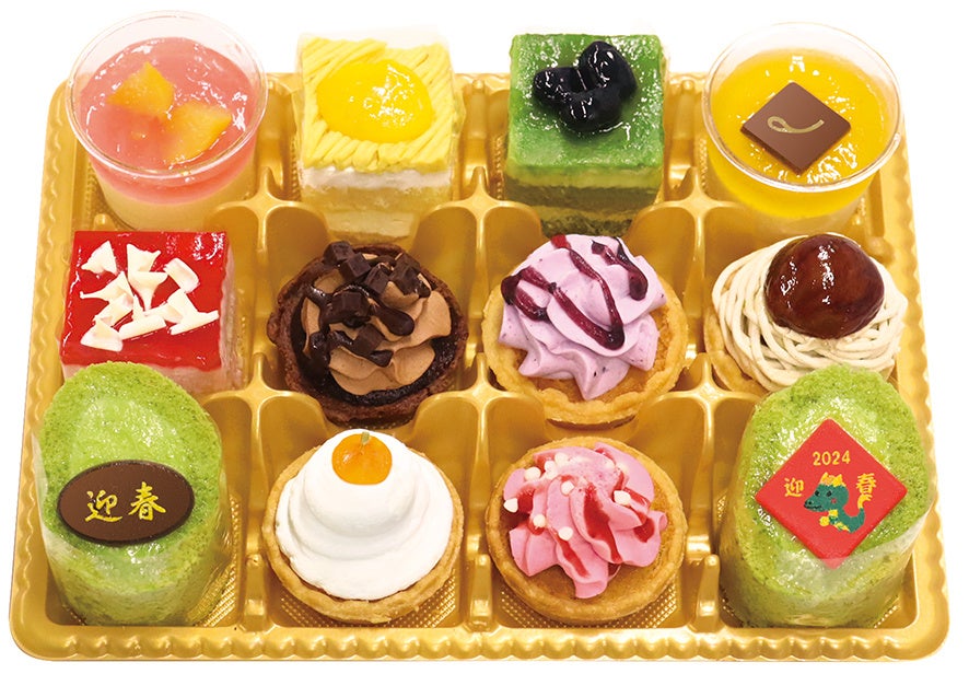 門松をイメージしたロールケーキや鏡餅をイメージしたタルトなど、お正月らしいプチスイーツを12種アソートしました。