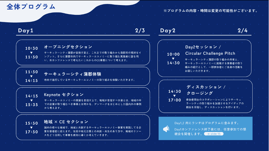 内容:サーキュラーエコノミーを実装に導く「連携」の形を考え、サーキュラーシティ蒲郡の取り組みを加速させるコミュニティ形成を目指します。
