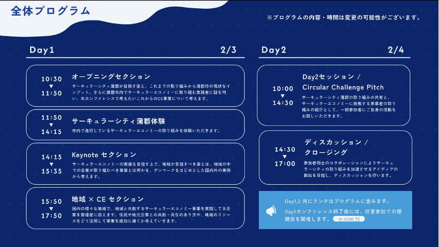 本カンファレンスでは、サステナブルの先進地域であるデンマークのサーキュラーエコノミーの取組や、花王株式会社や注目のスタートアップ企業などの国内における取組を紹介いただきます。加えて、サーキュラーシティ蒲郡の実証現場の見学や体験、参加者同士のディスカッションを通じて、これからの蒲郡の持続可能な事業・地域のあり方を考えます。