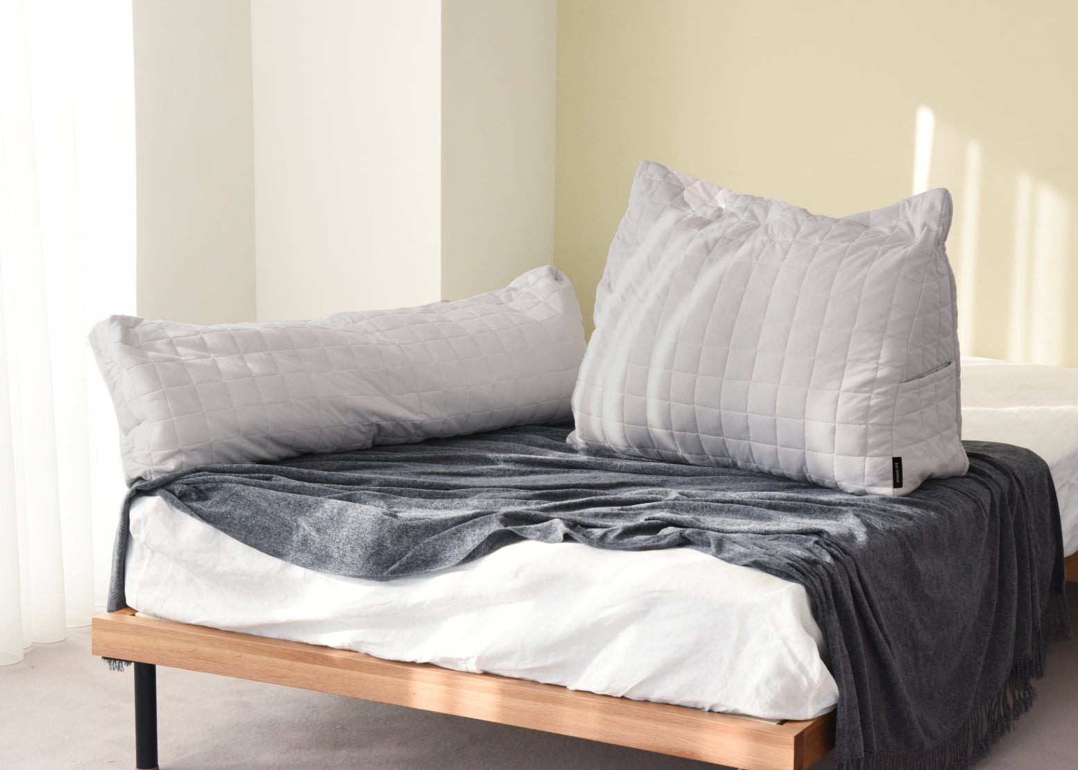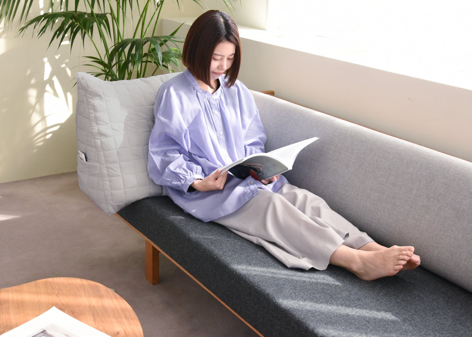 かたちは背もたれにできる「トライアングル型」と、抱き枕になる「ロング型」の2種類で、リビングでも寝室でも使いやすい展開に。