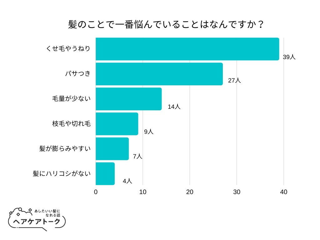 株式会社AWA(https://a-w-a.co.jp/)が運営するヘアケア情報メディア「ヘアケアトーク」(https://haircare-talk.com/ )は、日本全国の10代以上の女性を対象に「髪のことで一番悩んでいることはなんですか?」についてのアンケート調査を実施しました。