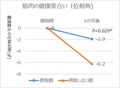 高齢者におけるたんぱく質摂取と身体機能低下予防に関する調査として、デイサービスに通う単身および高齢者世帯の要介護高齢者に対し、1食あたりたんぱく質20g以上(ごはん170g含む)の「幸たんぱく食」を6か月間、最大で昼夜2食摂取する群(86.6±3.9歳)と摂取しない群(86.8歳±7.1歳)※1に分けて比較調査を実施しました。両群ともに加齢による身体機能低下を見られたものの、「幸たんぱく食」を摂取した群は摂取しない群と比較して、機能低下が鈍化する傾向があるという結果になりました。要介護者に対して、たんぱく質量が整った「幸たんぱく食」を摂取することにより、身体機能の低下予防につながる可能性があるということが分かりました。具体的には、筋肉の健康度合い(位相角※2)の開始時から6か月後の変化率比較において、「幸たんぱく食」摂取群は-1.9%だったのに対し、摂取しない群ではー6.2%と有意な差が認められました。