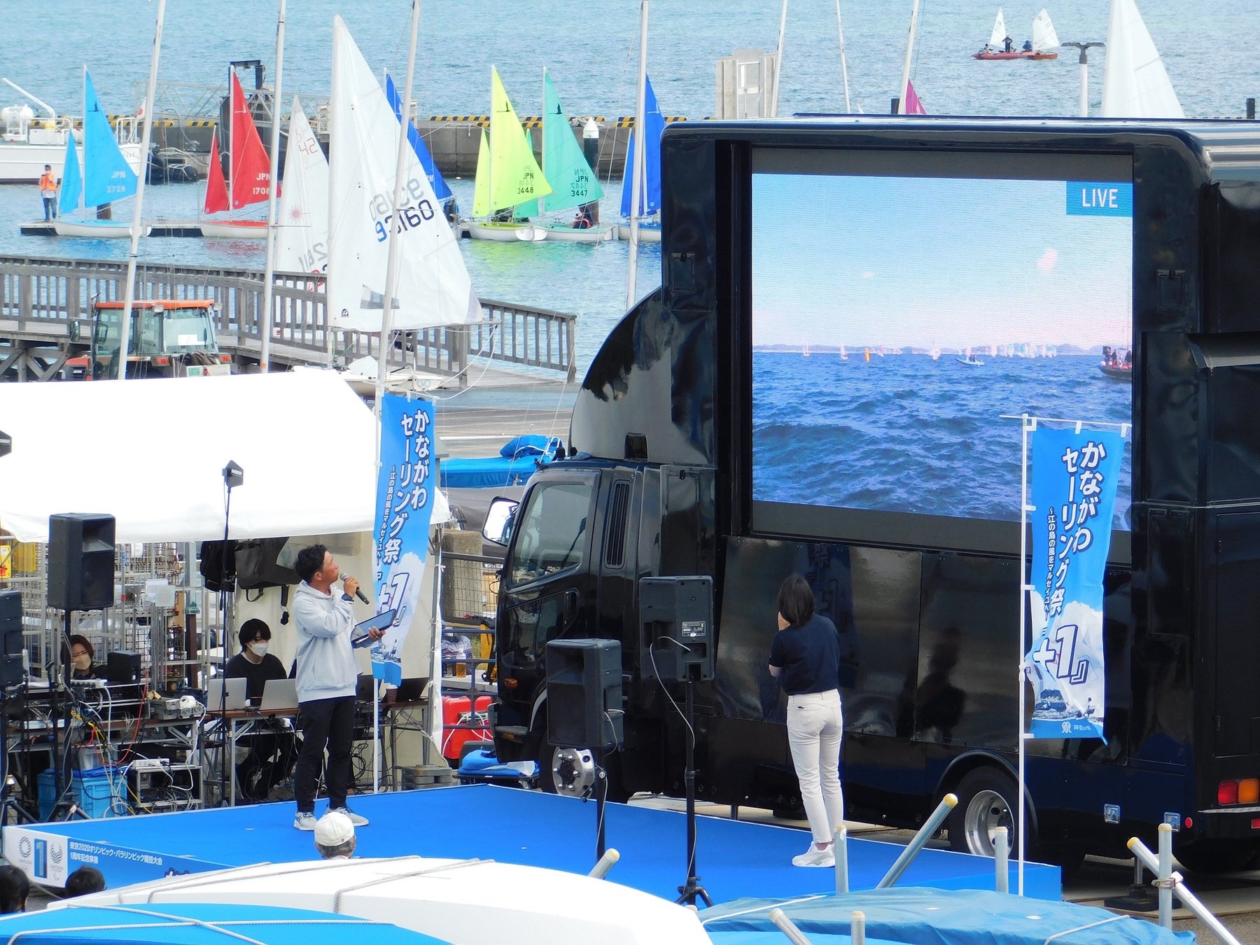 大型モニターを設置し、実際に海上で行われるセーリングのレースを放映します。セーリング競技の経験が豊富な伊藤一石(いとう かずいし)氏と現役プロセーラーによる解説を聞きながら観戦することができます。
