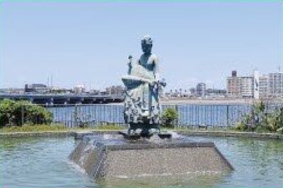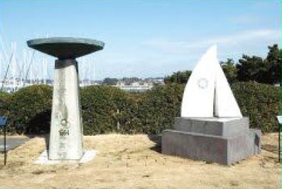 上から、江島神社鳥居、噴水池モニュメント、ヨットハウス前銘板、聖火台とモニュメント